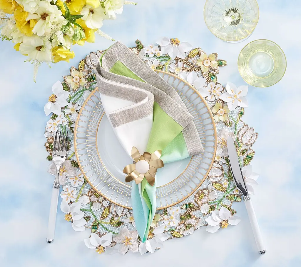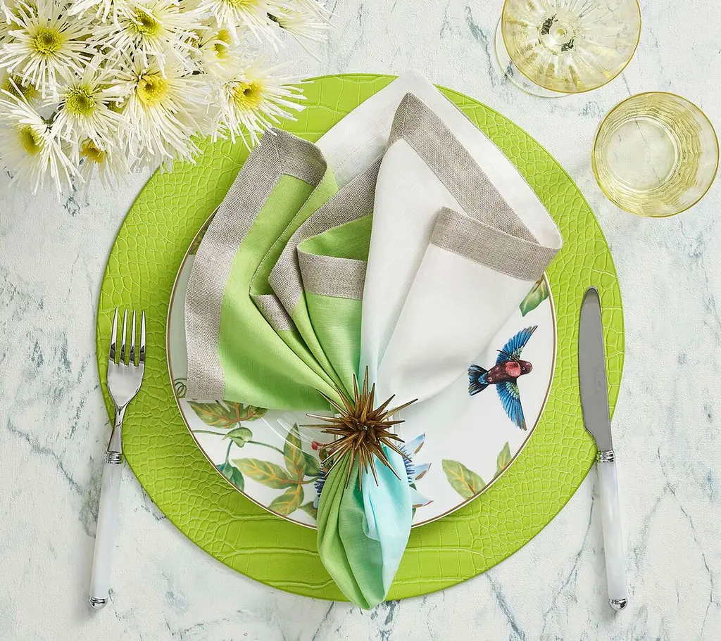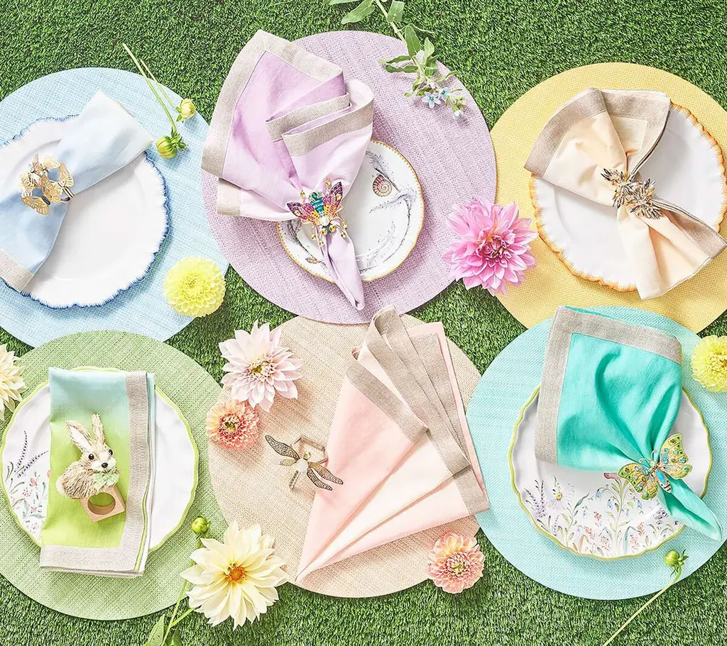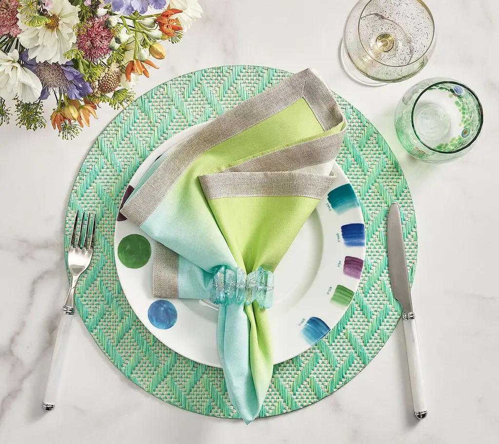 The Dip Dye Napkin features an ombre gradation, adding a subtle elegance to the refined napkin. This gorgeous color combination complements any table setting. These napkins are hand-dipped and dyed and accented with a luxurious metallic foil border. Each is hand-crafted by the finest artisans, with variations in density and depth of color to be expected.