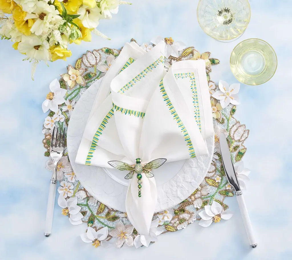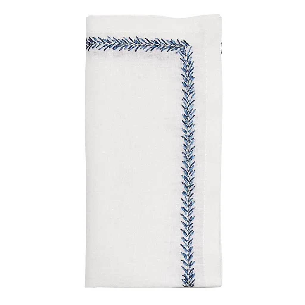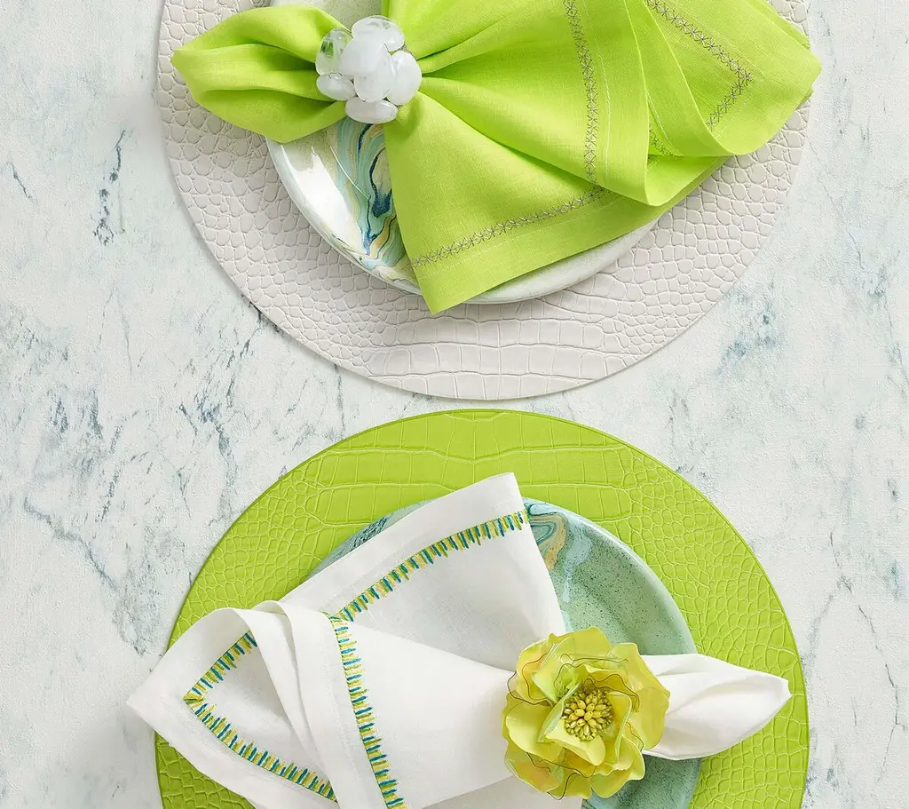 A fresh take on the classic, crisp white linen napkin, the linen Filament Napkin features long, floating embroidered stitching. These long stitches are reminiscent of the filaments in the center of a lightbulb and add a subtle elegance to any table.