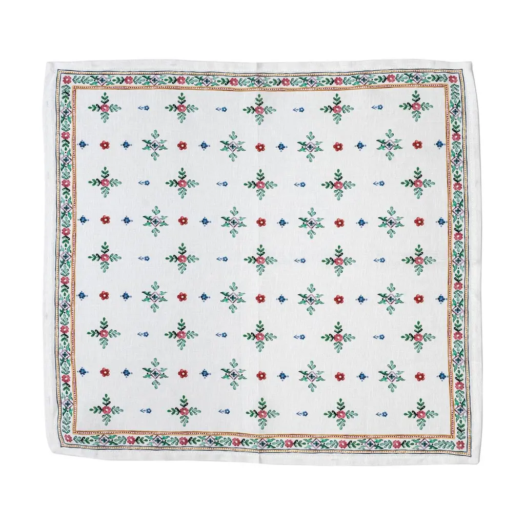 A folkloric wildflower motif from the Austrian alps in a playful pastoral pattern of edelweiss and bellflowers is done in joyful colors on a snowy white background. Vibrant and versatile, this linen napkin is designed to delight year-round, from summer’s al fresco entertaining to winter’s holiday gatherings.