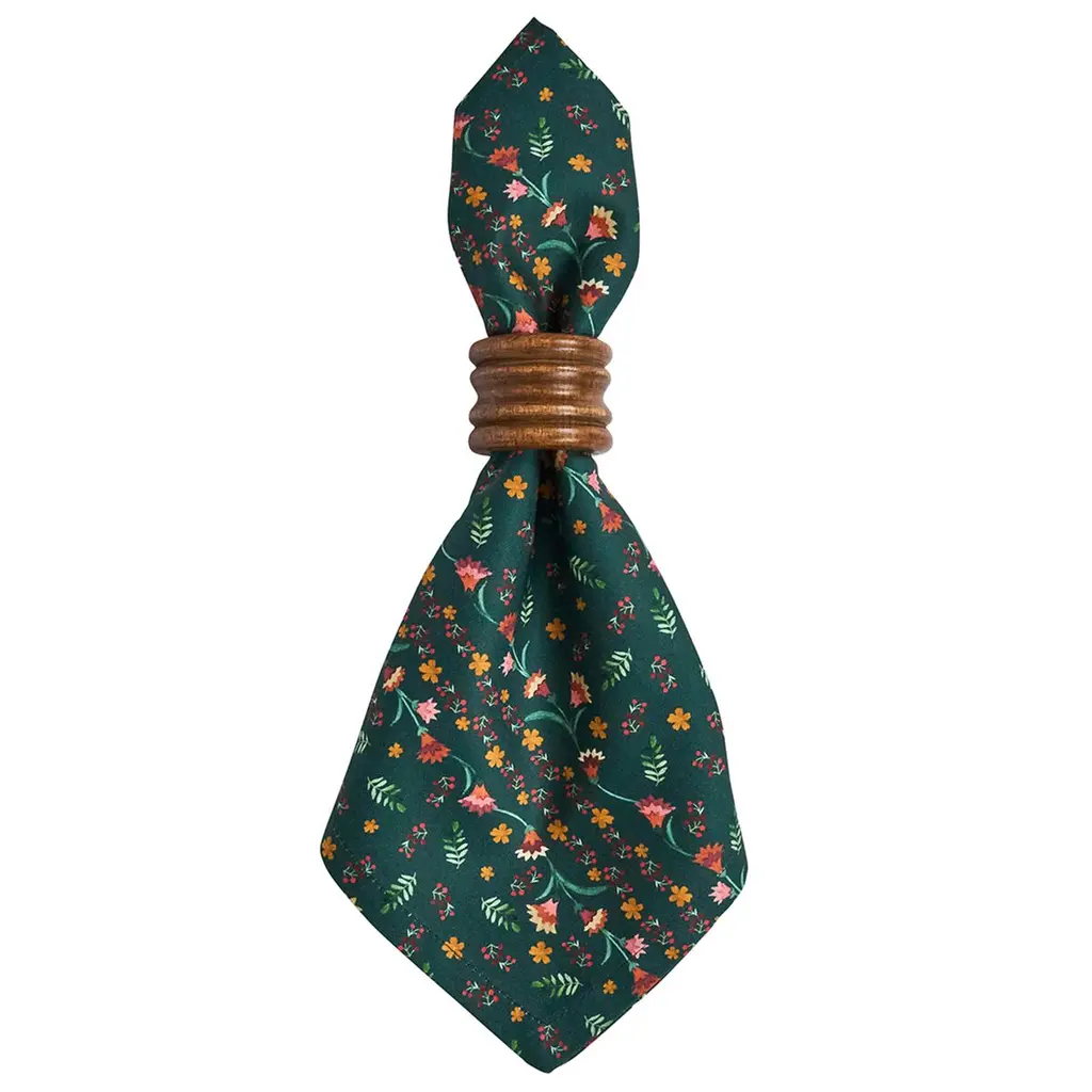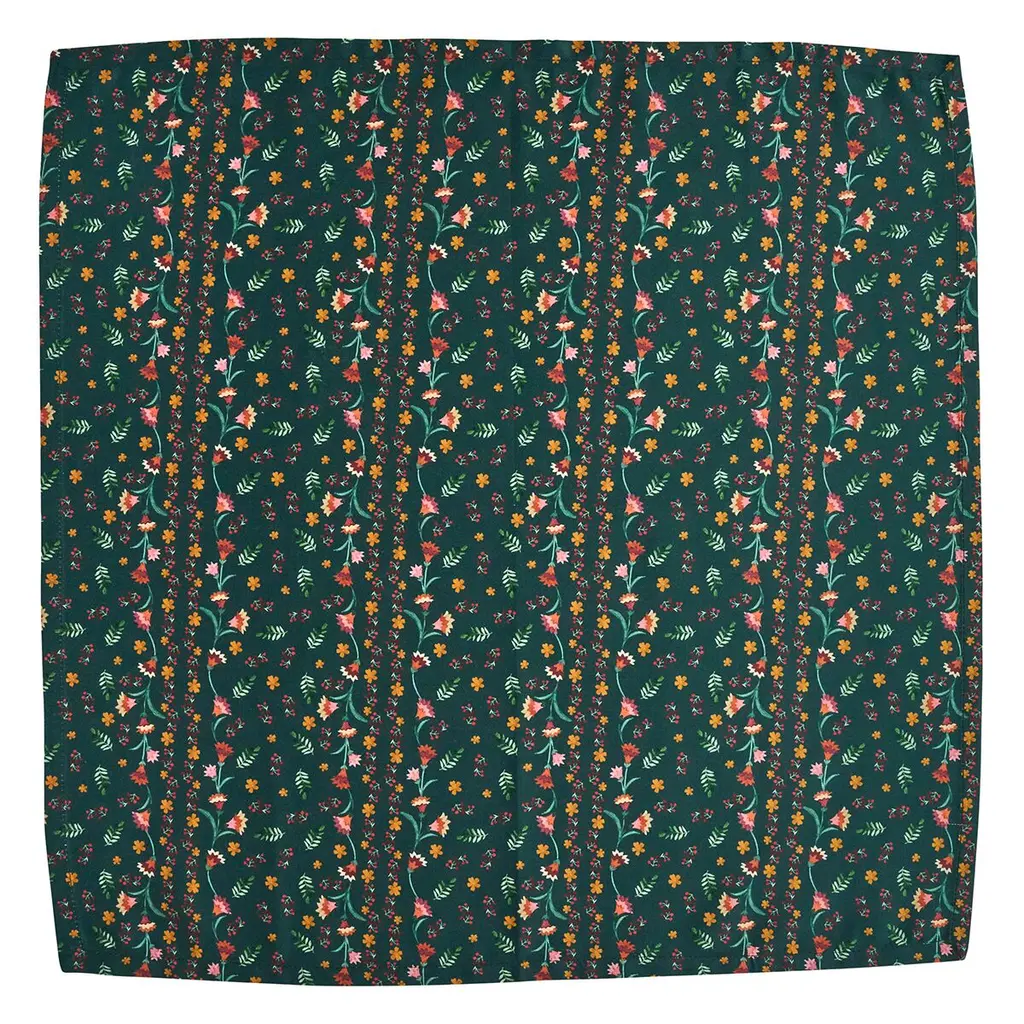 This set of four cotton napkins was inspired by charming Alpine chalets—as cozy as they are sweetly elegant—with colorful mountain wildflowers upon a deep, evergreen background.