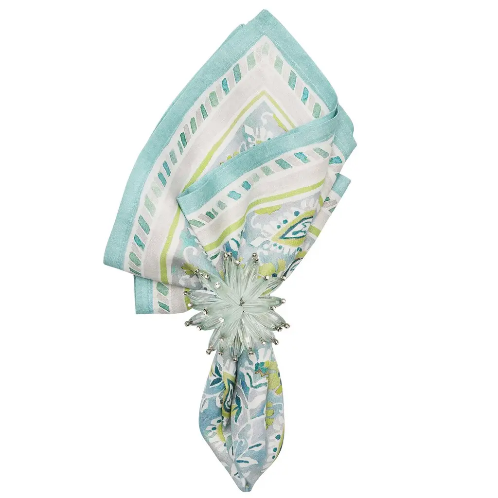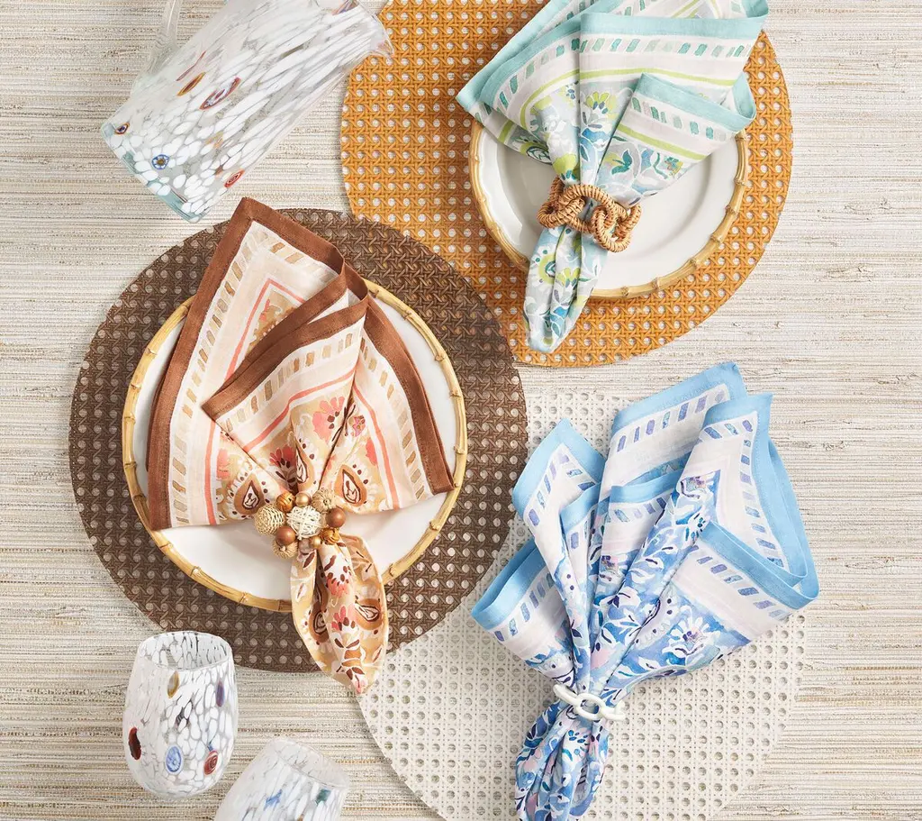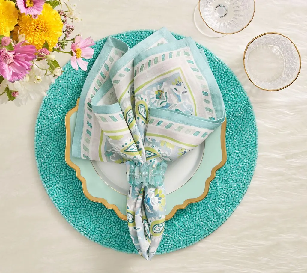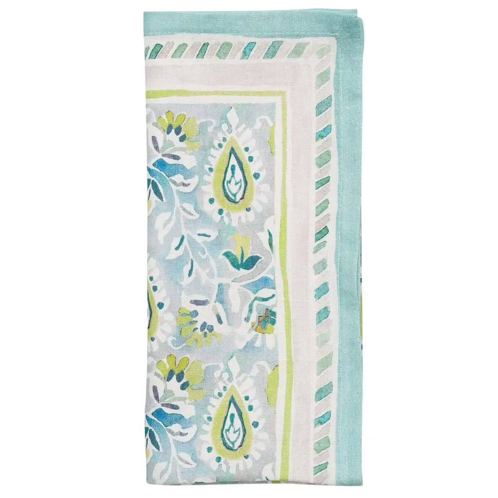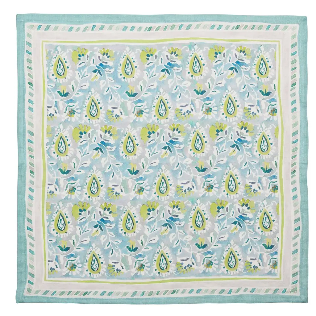 The Mira Napkin showcases hand-painted paisley patterns on luxurious linen. The bold backdrop illustrates nature-inspired vine motifs, accented by fresh pops of color. From garden parties to bridal showers, this napkin sets the tone for any occasion—especially when paired with the matching tablecloth.