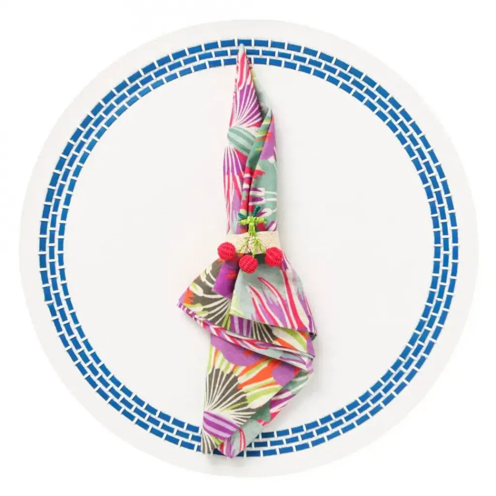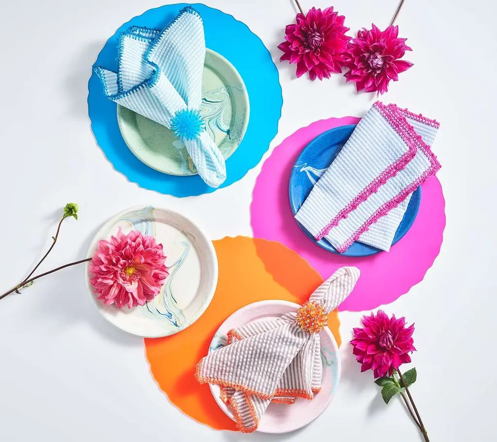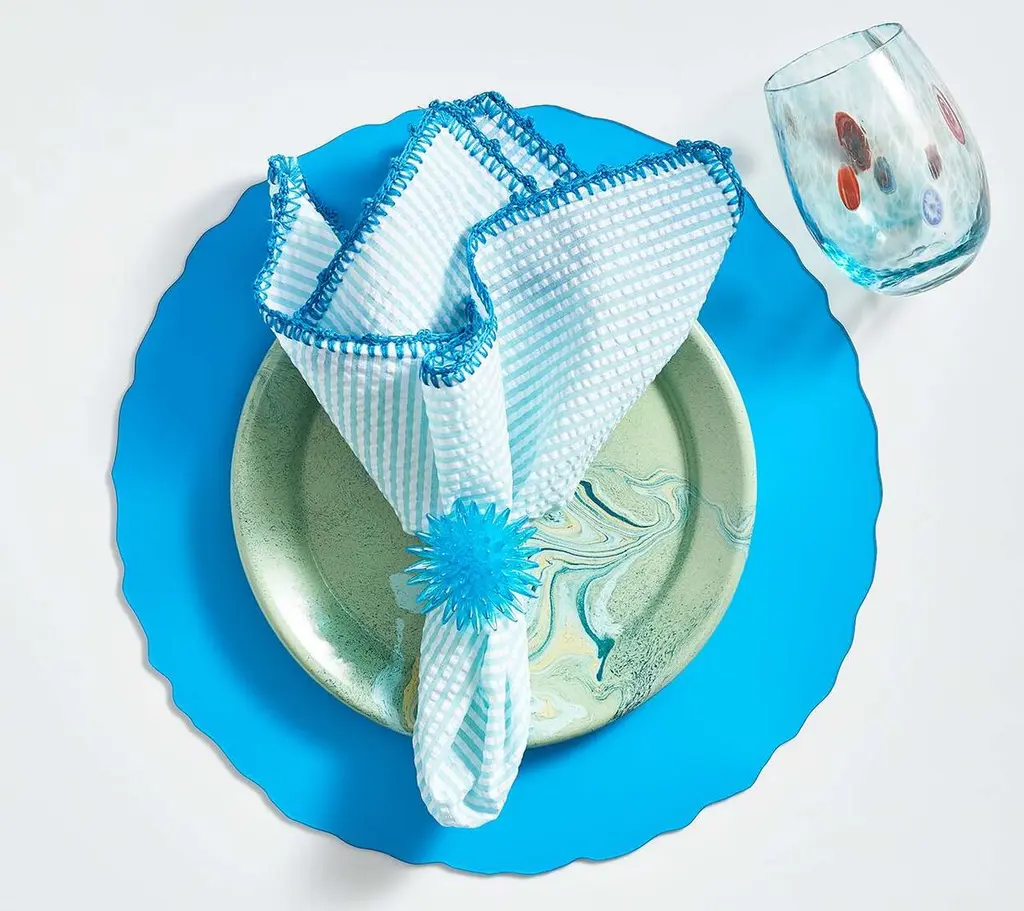 The Seersucker Napkin is the perfect summertime entertaining staple. Featuring a crinkled cotton fabric which allows for easy care, this napkin is designed with a hand-crocheted edge that adds a touch of elegance to any table setting.