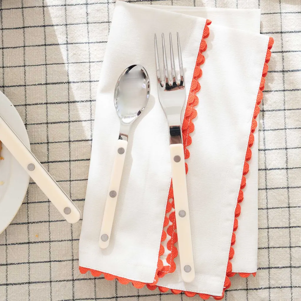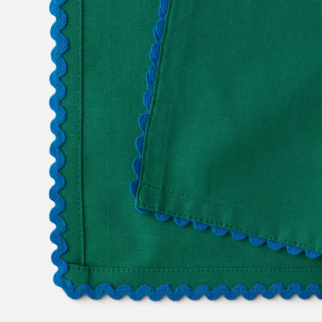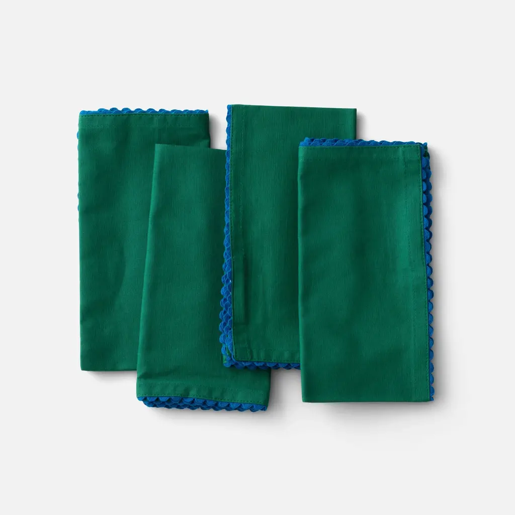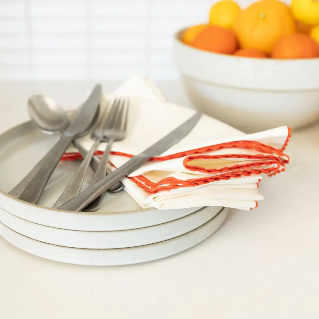 Liven up your table with this sweet and simple Scallop Trim Napkin Set. Made from a cotton linen blend for long lasting durability, these ricrac edged napkins add colorful character while infusing the home with a touch of nostalgia. Pair it with our Enamelware Collection for a bold tonal look or keep things classic by styling it with existing neutrals - the creative possibilities of this timeless textile are endless.