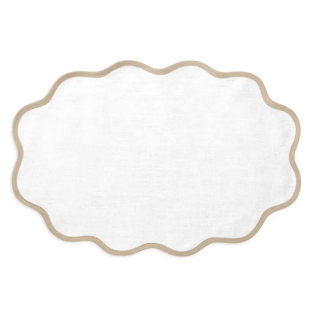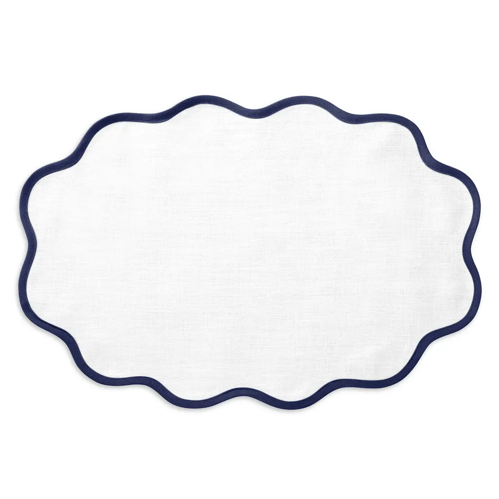 Undulating edges and a contrasting trim accent this lovely set of linens, from Matouk.