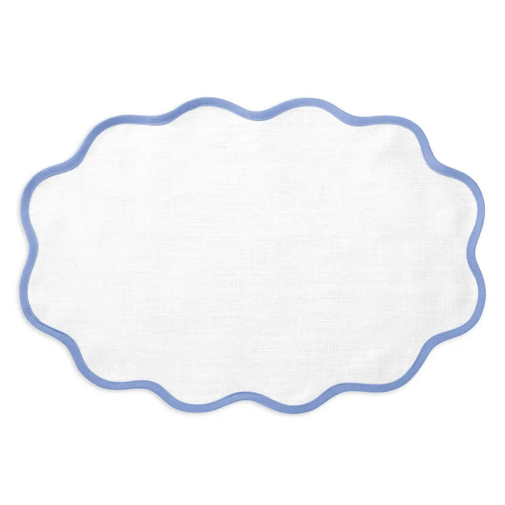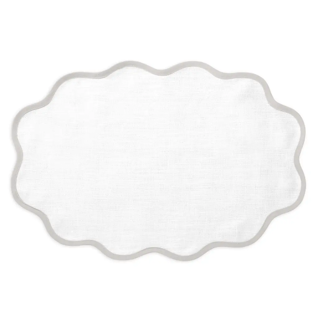 Undulating edges and a contrasting trim accent this lovely set of linens, from Matouk.