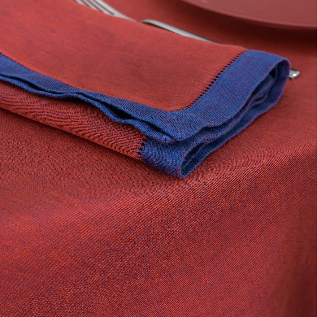 A refined jacquard weft minutely woven from pure Fiandra linen lends this napkin its distinctive exclusivity. The neat chromatic contrast between the blue borders and central Marsala-red tone gets elegantly underlined by a minute hemstitched detailing that speaks to the precious artisan tradition behind the design. Please consult the Concierge for care instructions.