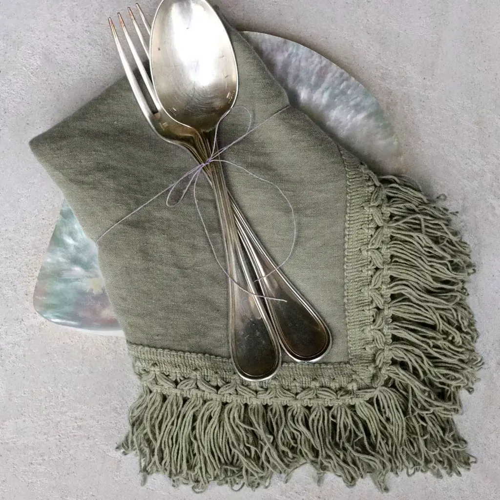 Injecting rustic charm and a decorative touch to any dinner place setting, Once Milano introduces napkins trimmed with looped tassels in its extensive colour palette. Experiment with tonal colour co-ordinated with placemats or tablecloths for a tablescape that is bold as it is elegant. Sold in a Set of 4. 100% linen gr 165/sqm one size 56x56cm