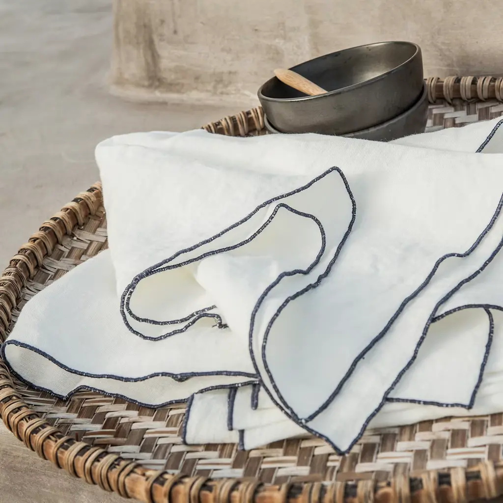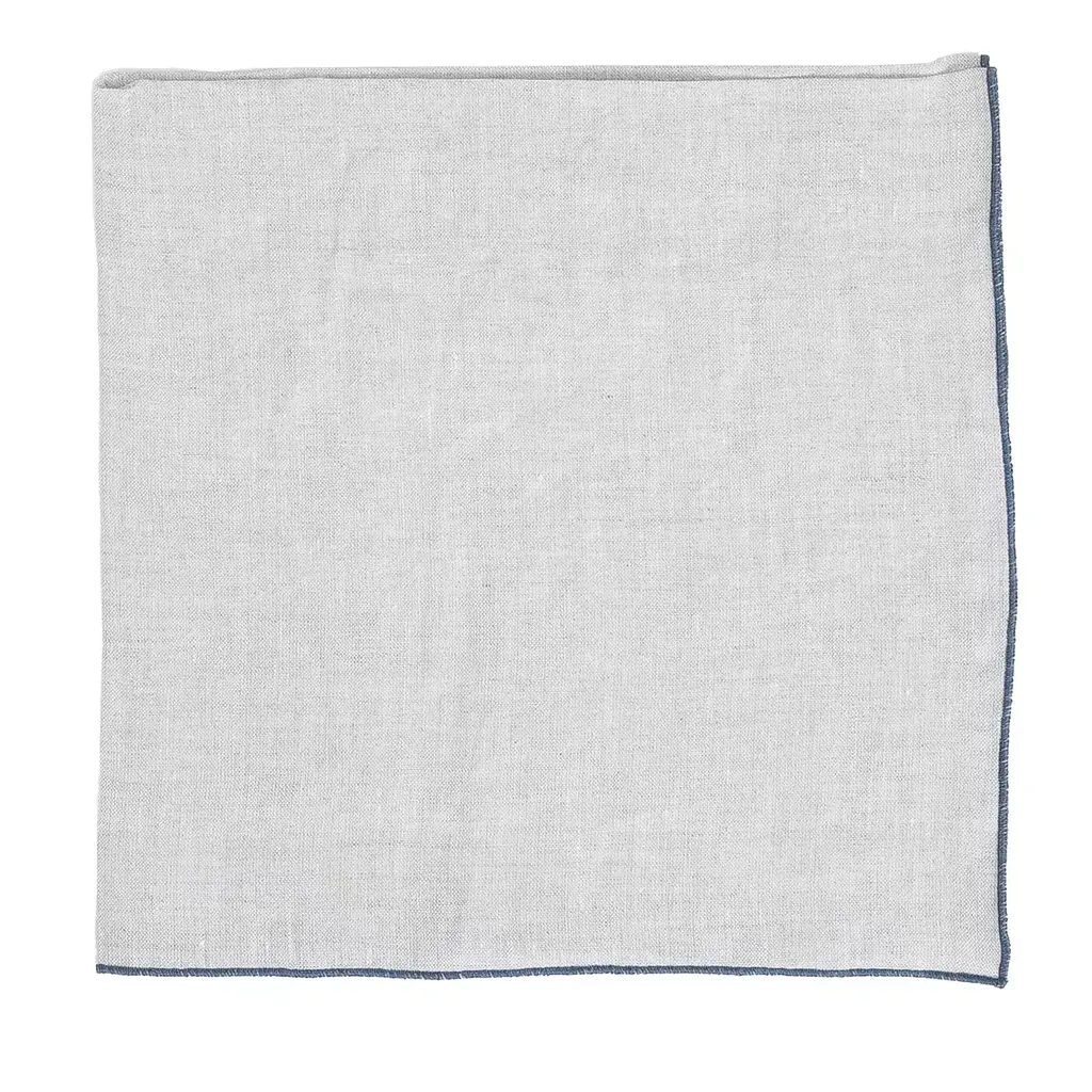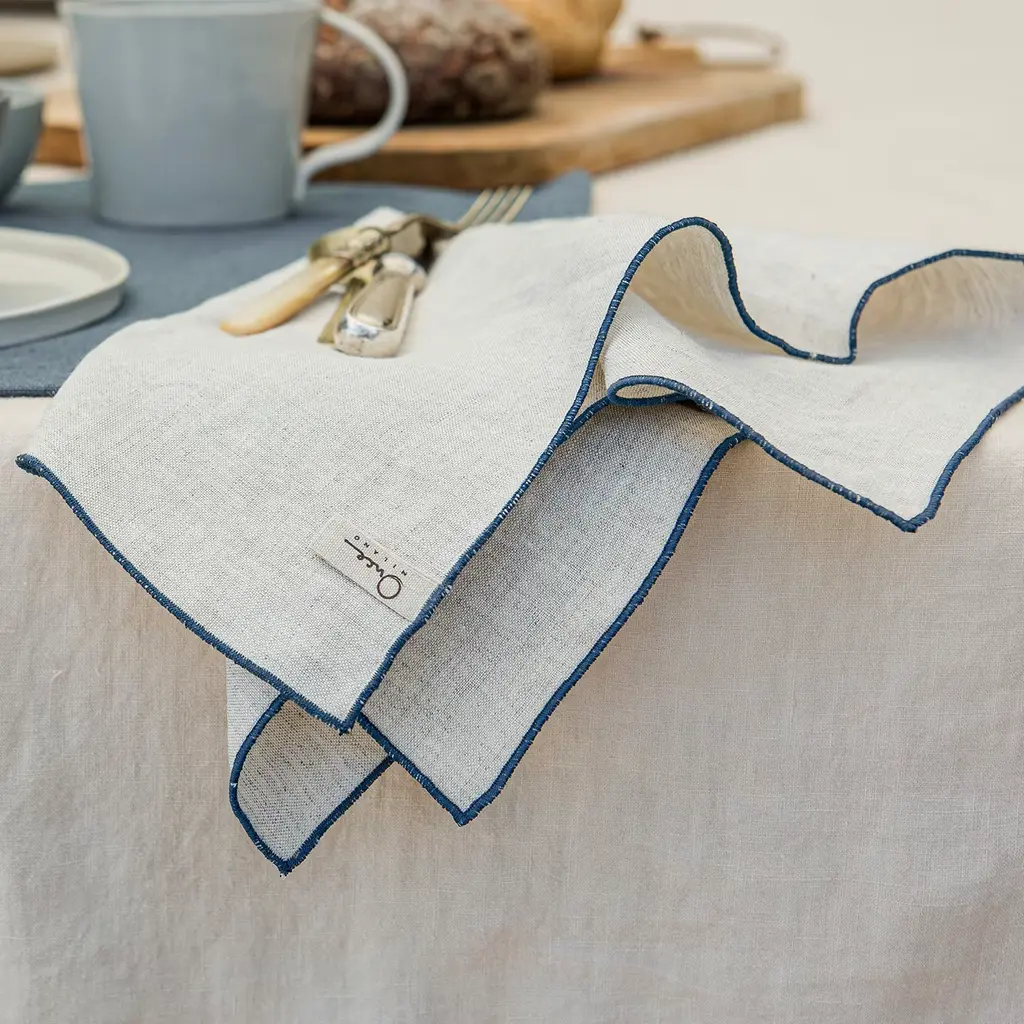 Set Of 4 Natural Linen Napkins With Stone Blue Rolled Hem