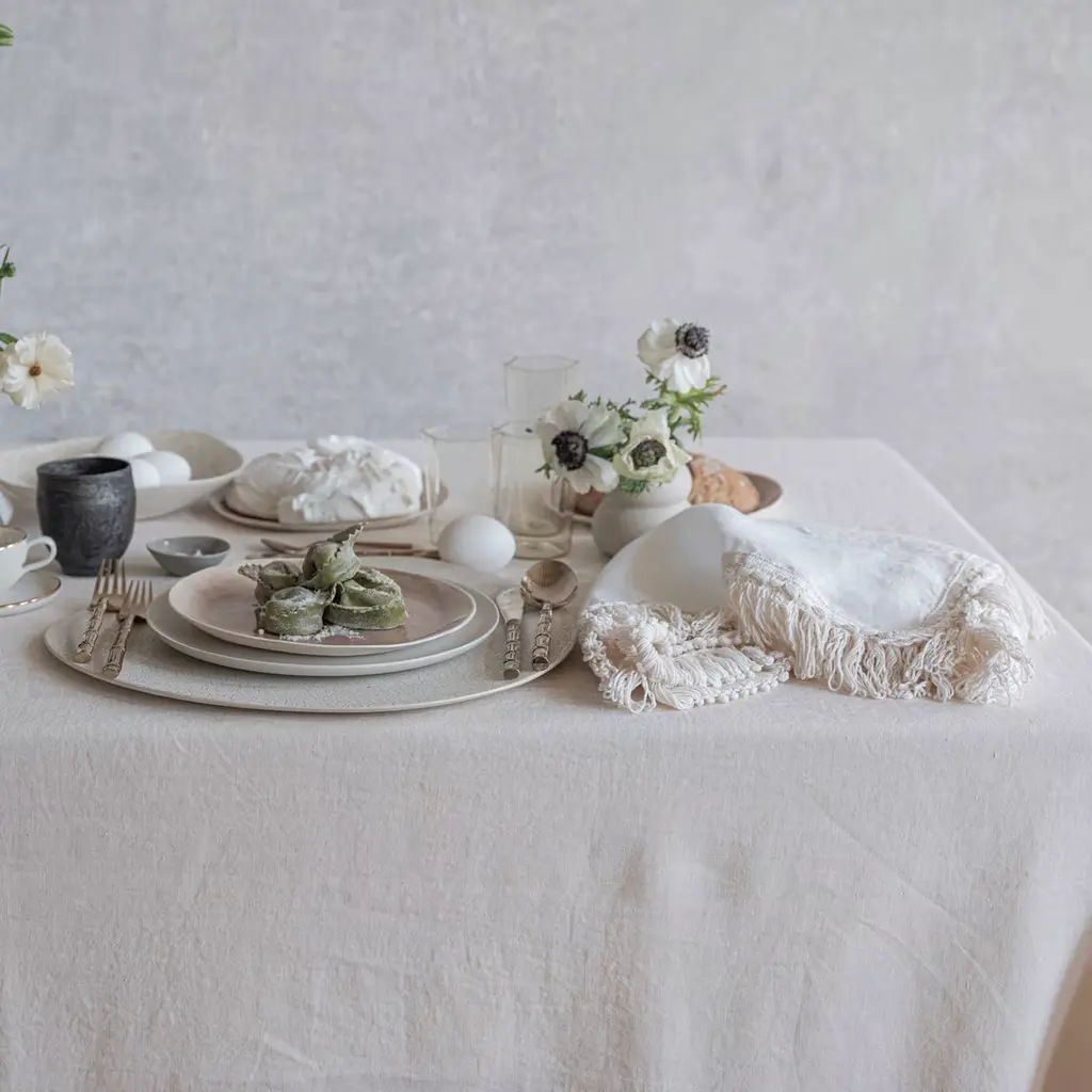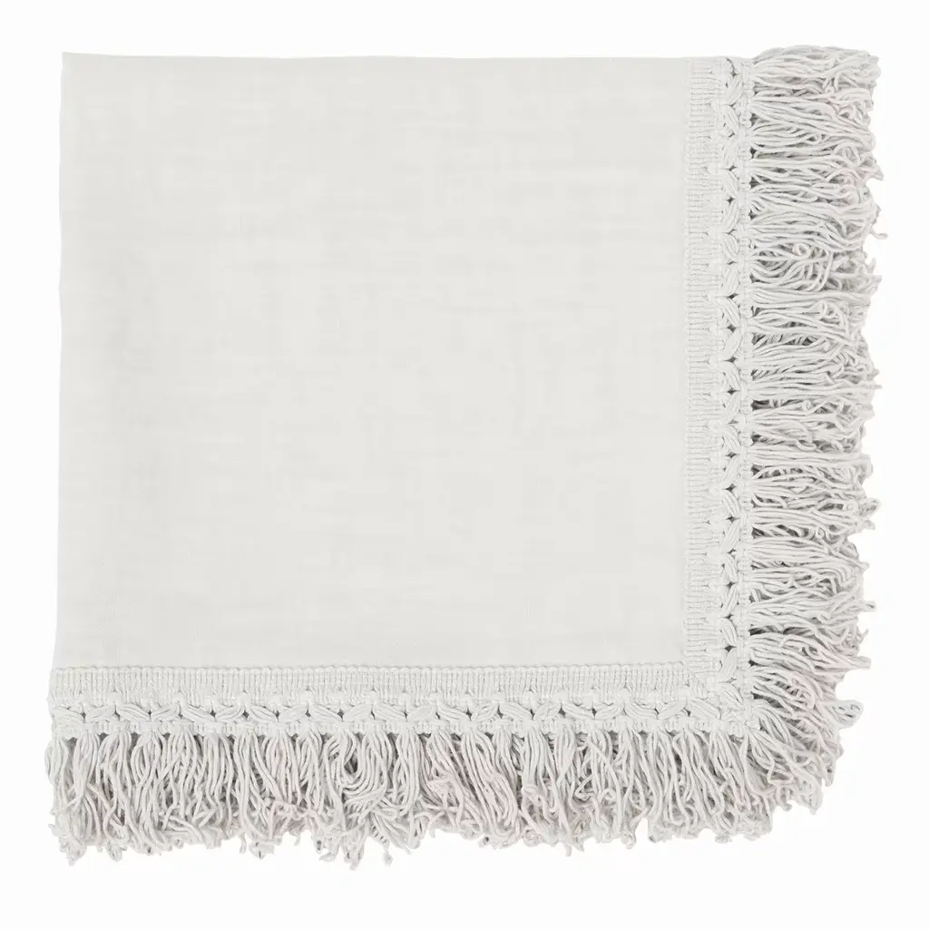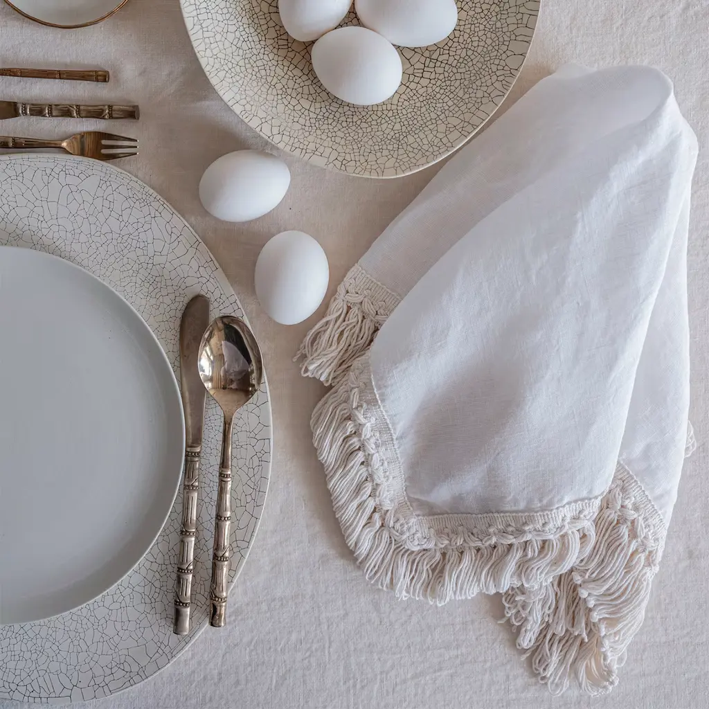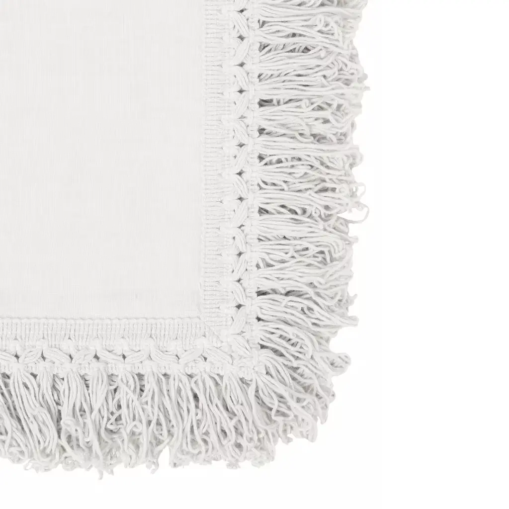 Enhance your dining experience with this set of 4 white linen napkins, featuring a 6cm long fringe on all sides. The fringe adds rustic charm and a decorative touch to any table setting. Made from high-quality linen, these napkins combine functionality with style. Perfect for adding a unique, elegant flair to both everyday meals and special occasions. Available in a wide range of colors, please ask the concierge for other details.