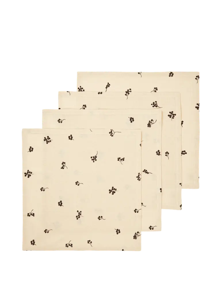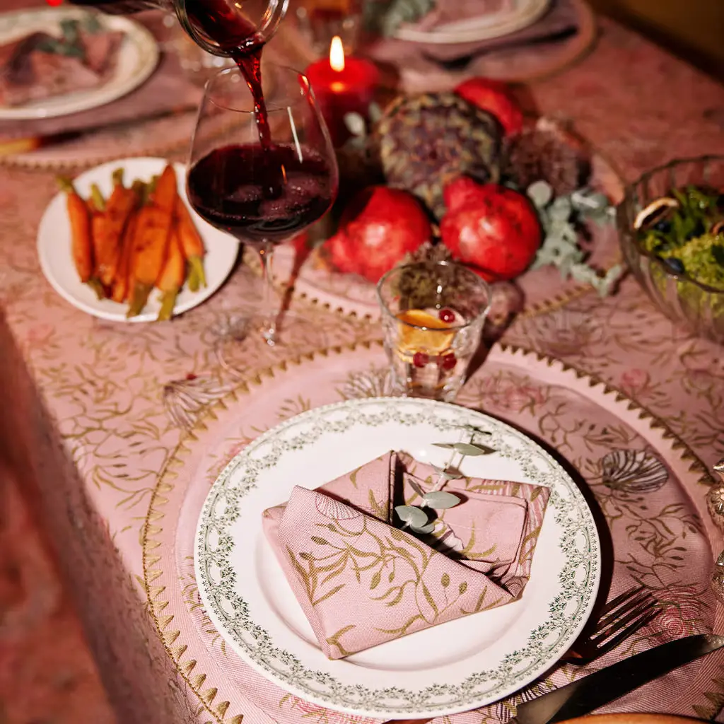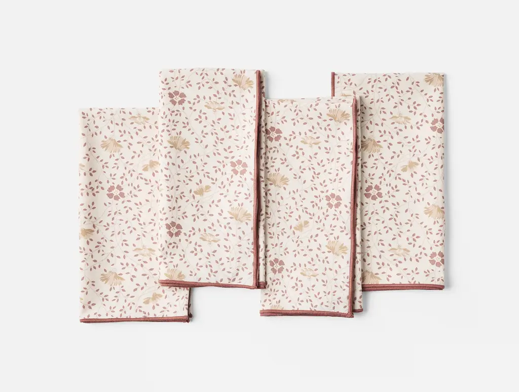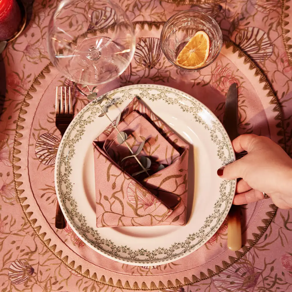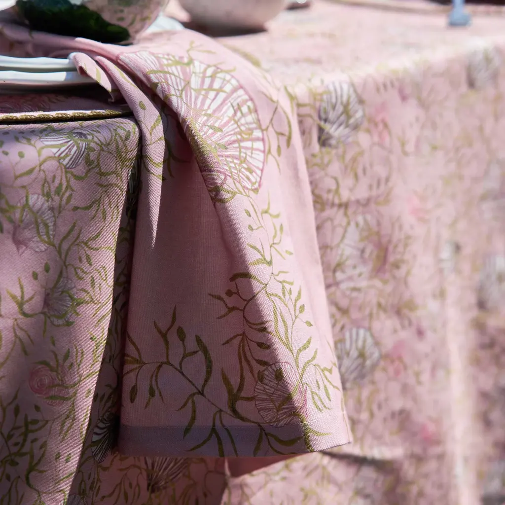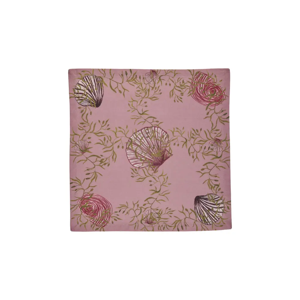 These six Napkins in our mussels and shells print with beautiful muted greens on a classical dusty pink background will create a dreamy atmosphere on your table at home. Called Mussels from Brussels these are technically clams but the name was too good to pass on. Don't forget to check out their matching tablecloth and placemats for an all over dreamy feel in your home. Use a white plate for a more minimalist look.Made from 100% Organic Cotton and printed with low impact dyes.Six napkins per set. Each napkin is 18"x18" / 46x46cm unfolded.
