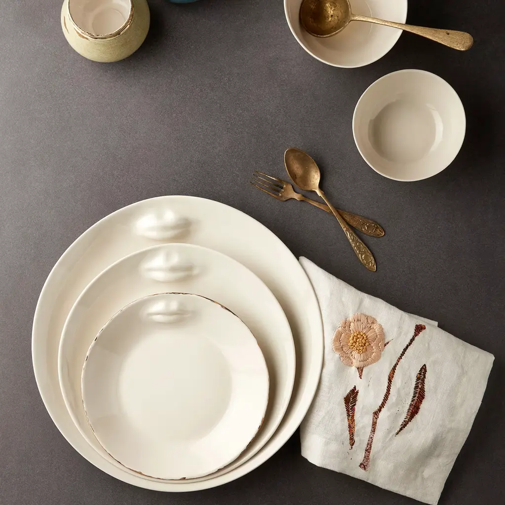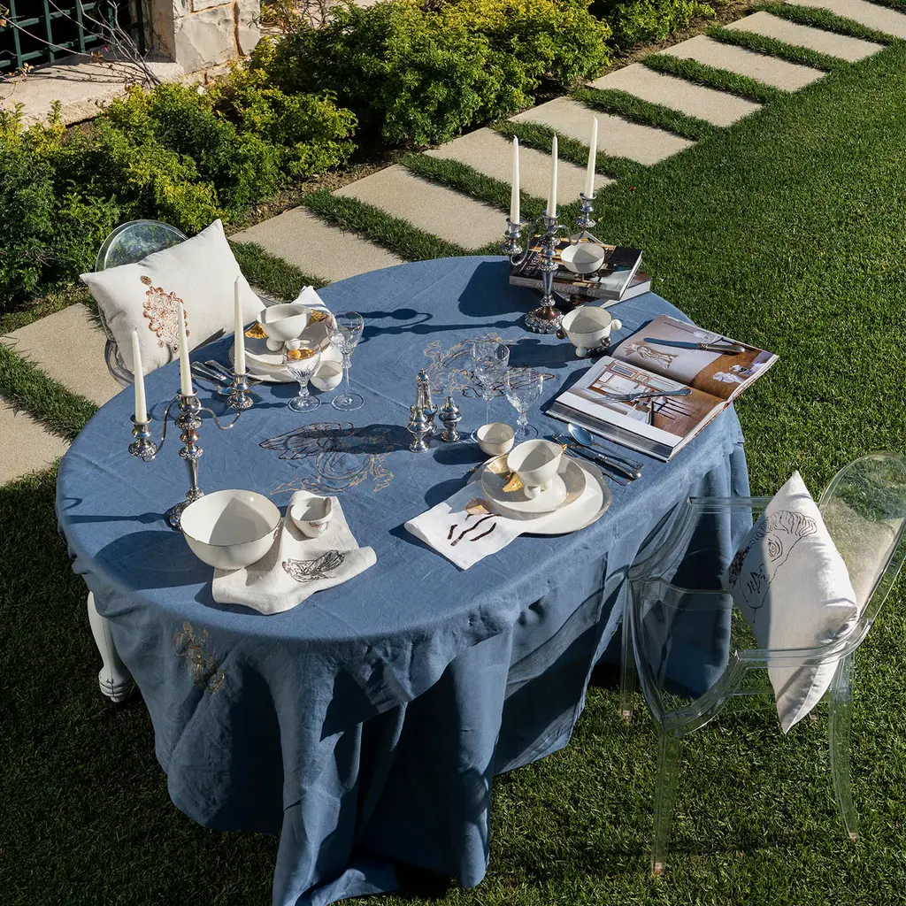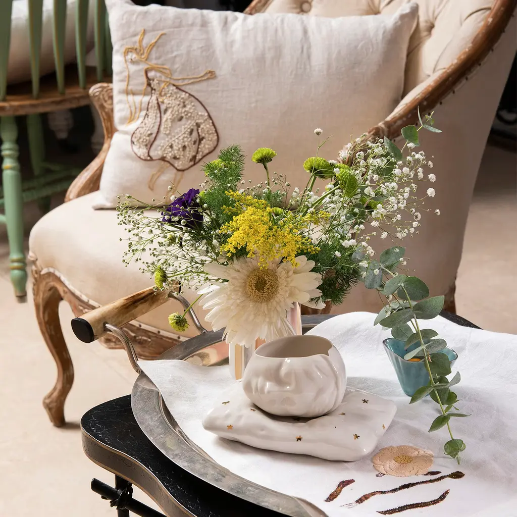 Our Sophie Kiss Wire Breaking Napkin from the Mythos Collection features a hand-embroidered flower motif using a traditional Anatolian ‘wire-breaking’, metallic embroidery technique on white linen. Our artisans have crafted it with hand embroidery.You can create your own set by purchasing different quantities according to the needs of your table and combining them with other Maji Atelier products.