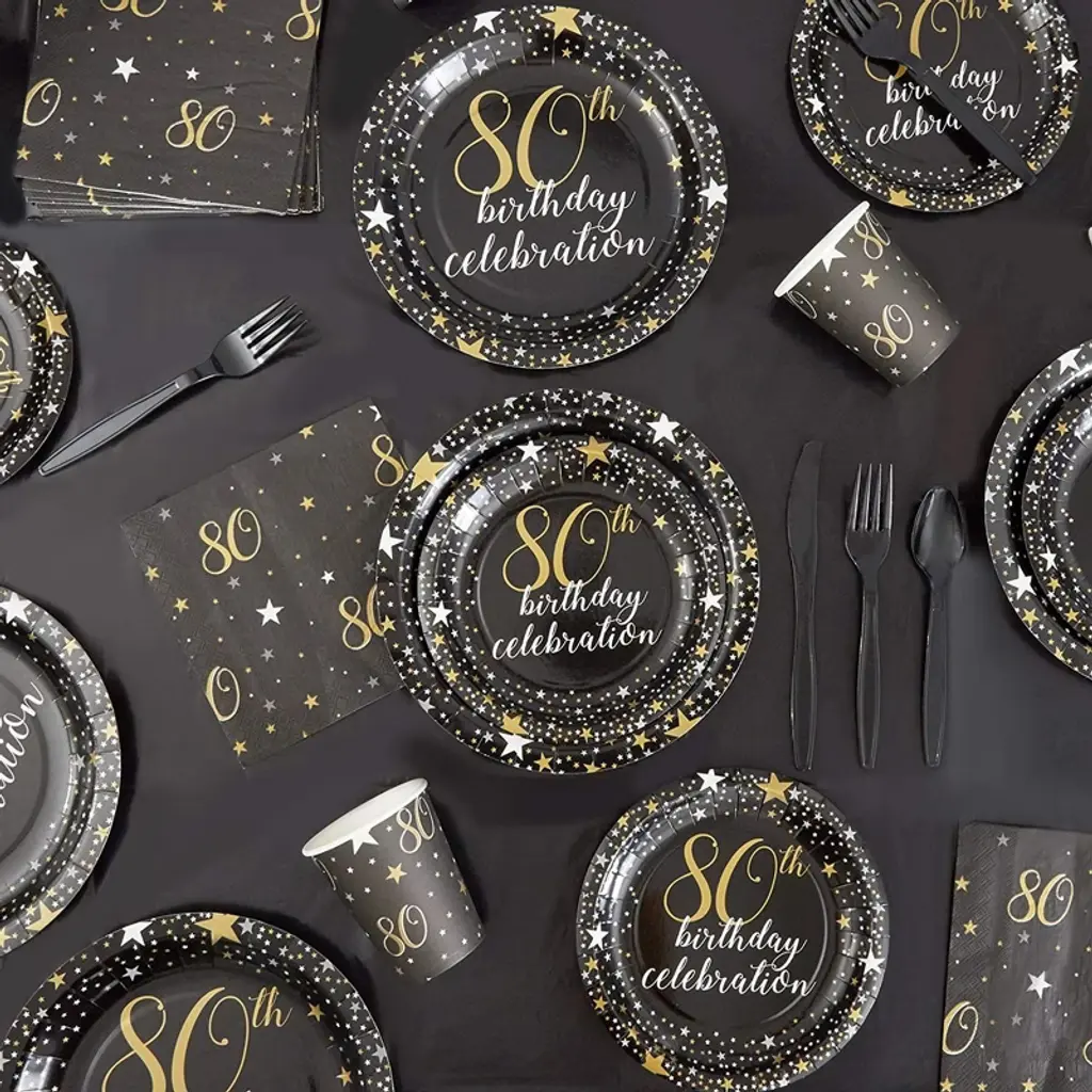 Sparkle And Bash 100 Pack Bulk Happy 80th Birthday Napkins For Party Decorations, 2-ply, Black And Gold, 6.5 X 6.5 In