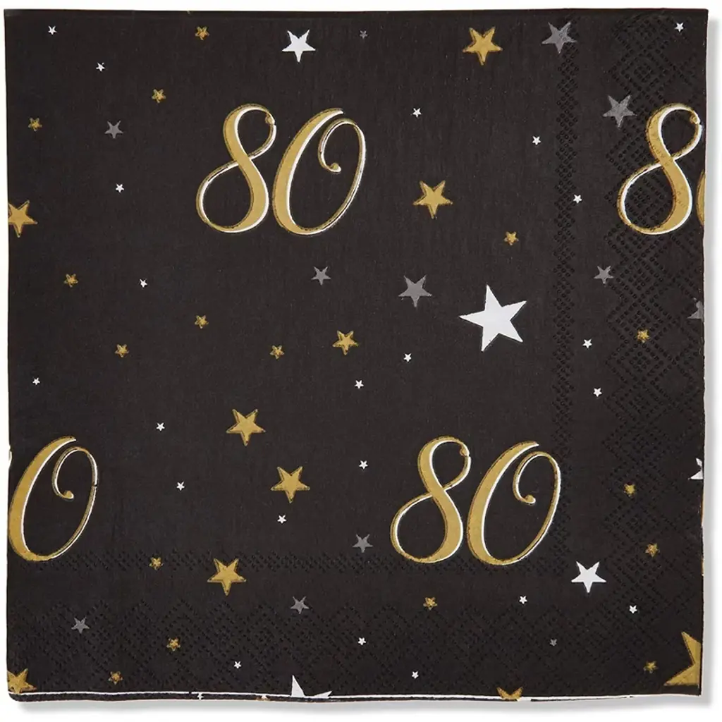 Our cocktail napkins are the perfect choice for celebrating special moments. These 2-ply 80th birthday napkins are built to last, crafted with heavy-duty paper that resists tearing and falling apart. Plus, each napkin is stamped with elegant gold foil lettering, making them an eye-catching addition for celebrating an 80th birthday or anniversary party table setting. Each napkin measures 6.5" x 6.5" when folded and 13" x 13" when unfolded, making them the ideal size for serving appetizers, drinks, formal dinners, and bar tops. The black background provides a timeless look that will never go out of style, while the number 80 and star design perfectly commemorates a "Cheers to 80 Years" party or anniversary event. These disposable cocktail napkins make cleanup a breeze without sacrificing style or elegance; simply throw them away after use. They also make great gifts for anyone turning 80 years old; give on its own or pair with other party supplies for a unique present that will surely be appreciated by recipients. With 100 napkins in each package, you can rest assured that you won't run out during the festivities. This pack is the perfect choice to make your 80th birthday decorations for men and women into something truly extraordinary and unforgettable.