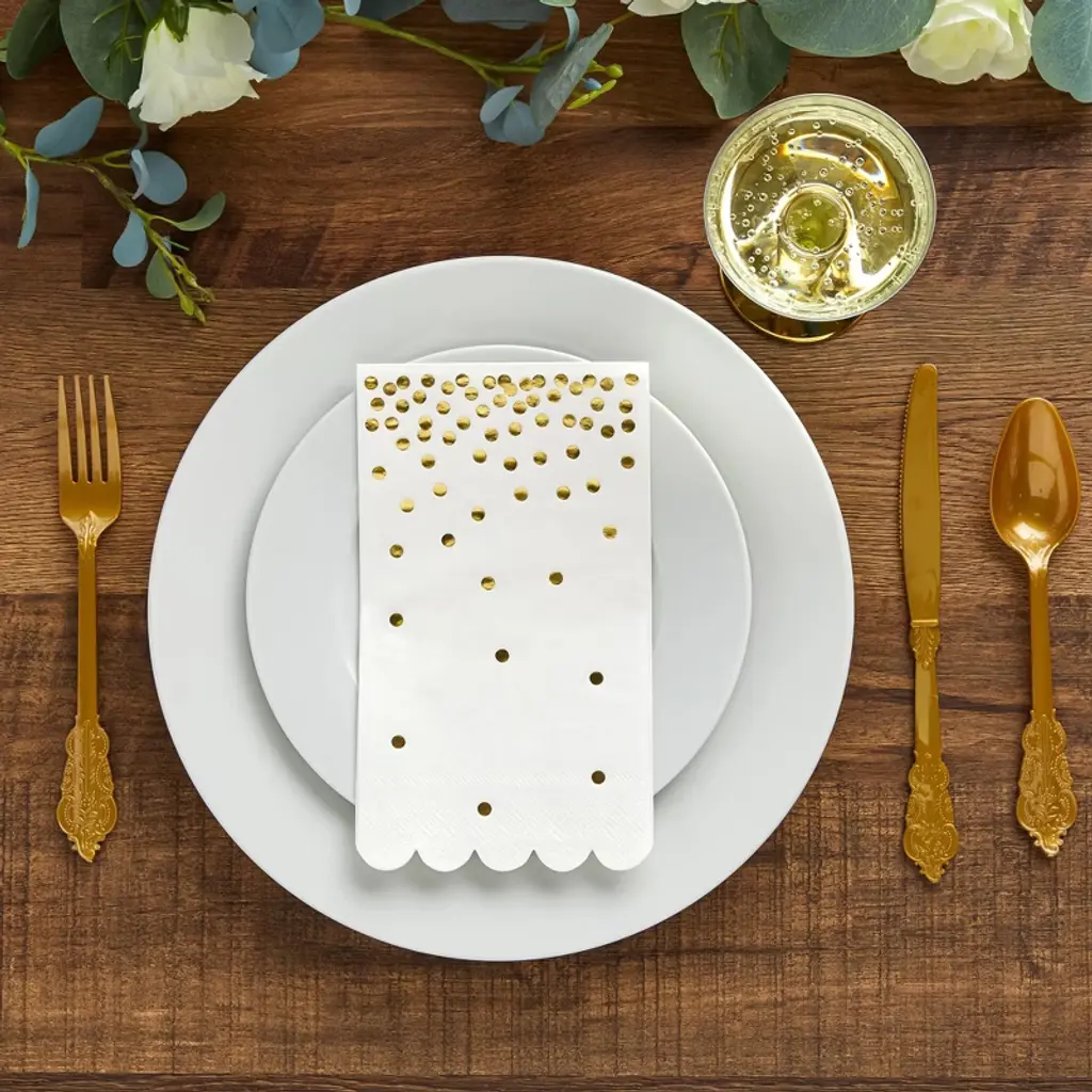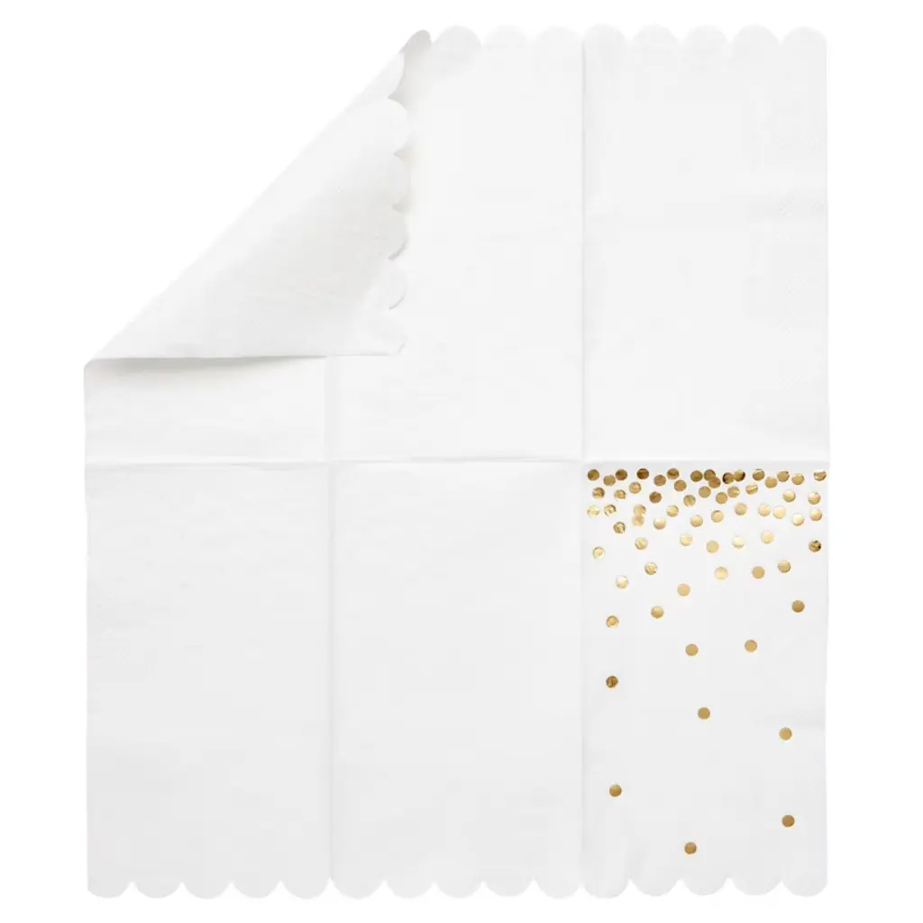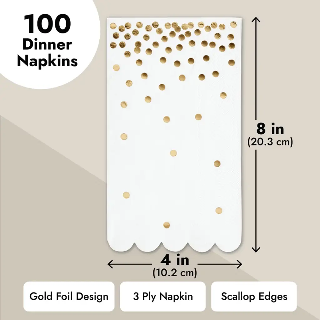 Check "white and gold dinner napkins" off your wedding, baby shower or birthday party supplies list with this pack of 100 beautiful, elegant white and gold scalloped dinner napkins! These napkins feature scalloped edges and gold foil polka dots that will perfectly complement your table decor. This set of 3-ply napkins are strong, durable and add a refined touch of class to any environment they adorn. Each napkin measures 4x8 inches folded and is an ideal compliment to appetizers, beverages, the main course and desserts. The gold dinner napkins disposable design ensures worry free cleanup after accidental spills and messes. PLEASE NOTE: These rehearsal dinner napkins feature gold foil accents and are not intended for microwave use.