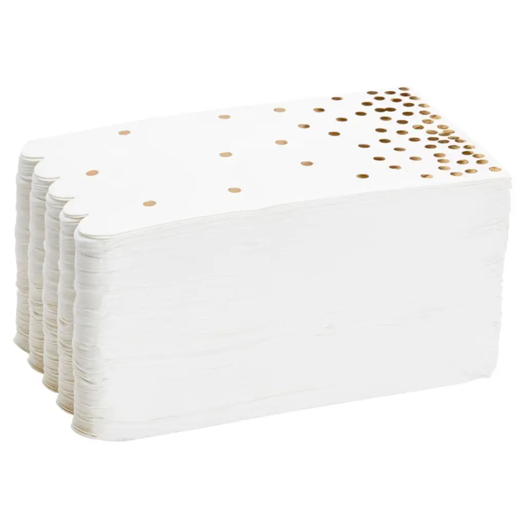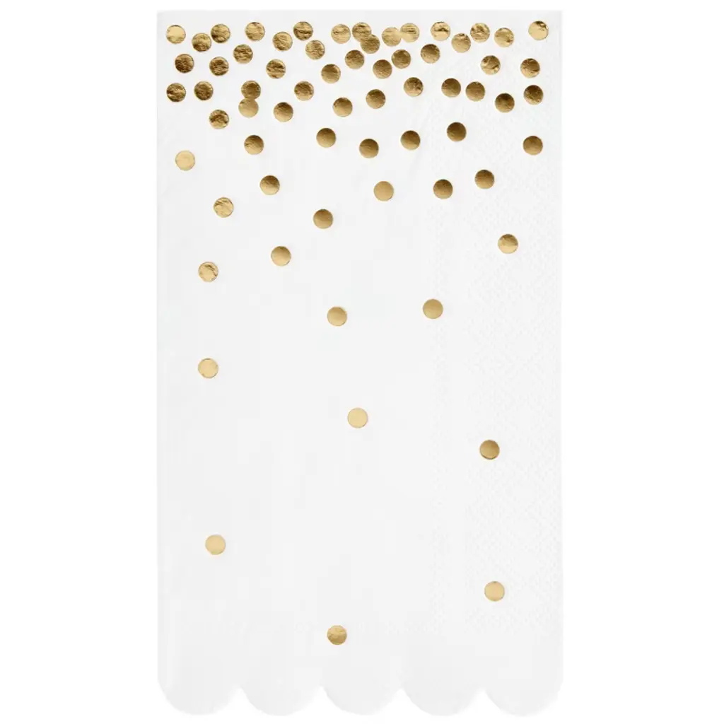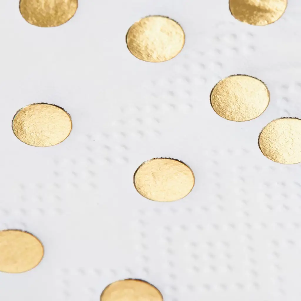 Check "white and gold dinner napkins" off your wedding, baby shower or birthday party supplies list with this pack of 100 beautiful, elegant white and gold scalloped dinner napkins! These napkins feature scalloped edges and gold foil polka dots that will perfectly complement your table decor. This set of 3-ply napkins are strong, durable and add a refined touch of class to any environment they adorn. Each napkin measures 4x8 inches folded and is an ideal compliment to appetizers, beverages, the main course and desserts. The gold dinner napkins disposable design ensures worry free cleanup after accidental spills and messes. PLEASE NOTE: These rehearsal dinner napkins feature gold foil accents and are not intended for microwave use.