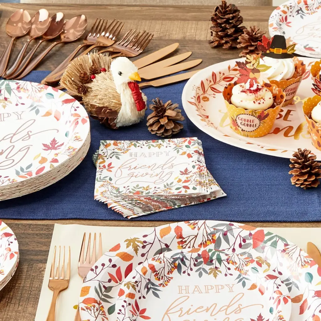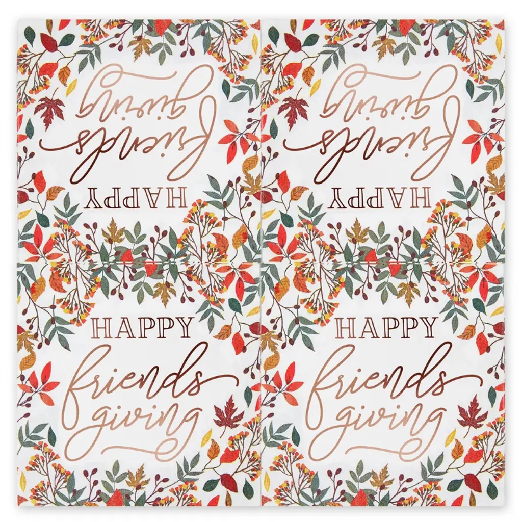 Create the perfect Friendsgiving vibe with these Friendsgiving napkins. Each napkin adds a festive touch with a stylish gold foil design and fall leaves, making it easy to coordinate your Friendsgiving party ideas. Guests will love this simple way to keep their hands and tables clean while enjoying drinks and snacks. These Friendsgiving favors are absorbent and durable, designed to handle spills and small messes without tearing. Made with 3-ply paper, these napkins bring both quality and style to your table, so everyone can focus on the fun. Whether you’re celebrating Friendsgiving with close friends or hosting a large gathering, these napkins help keep your space tidy and festive. With 50 napkins in each pack, you’ll have plenty for every guest. Use them as Friendsgiving table decorations or Friendsgiving gifts for guests to enjoy. These friends giving napkins adds a simple touch that shows you care about every detail of your gathering.