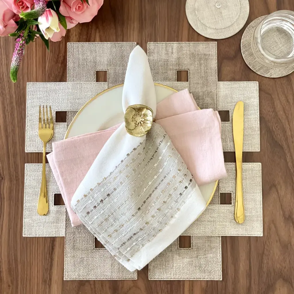 One of Bodrum's most popular groups, this metallic print group is spectacular. The spruce around the edge of the napkin is great for the holiday season. Works perfectly with Bodrum's Holly placemats.