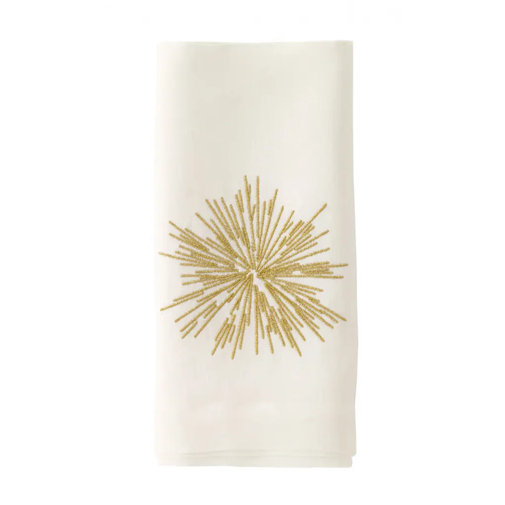 The explosion of metallic embroidery on this exquisite white linen napkin is sure to leave your guest with a memorable holiday experience. Starburst is the quintessential holiday party napkin!