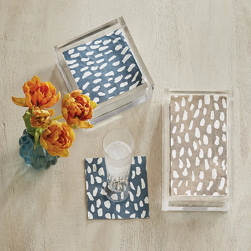 The painterly spotted pattern was created from a watercolor by our own talented artist. Our Thandie Paper Napkins offer the look of linen, the soft feel of cloth, and the ease of paper. These pretty paper dinner napkins and cocktail napkins are extra absorbent and durable, making them ideal for entertaining and everyday serving. Each decorative napkin is printed in Germany on linen-like, air-laid paper using non-toxic, water-based ink, so theyâre also biodegradable and compostable. Both styles are designed to fit our Acrylic Napkin Holders (sold separately). Thandie Paper Napkin features: