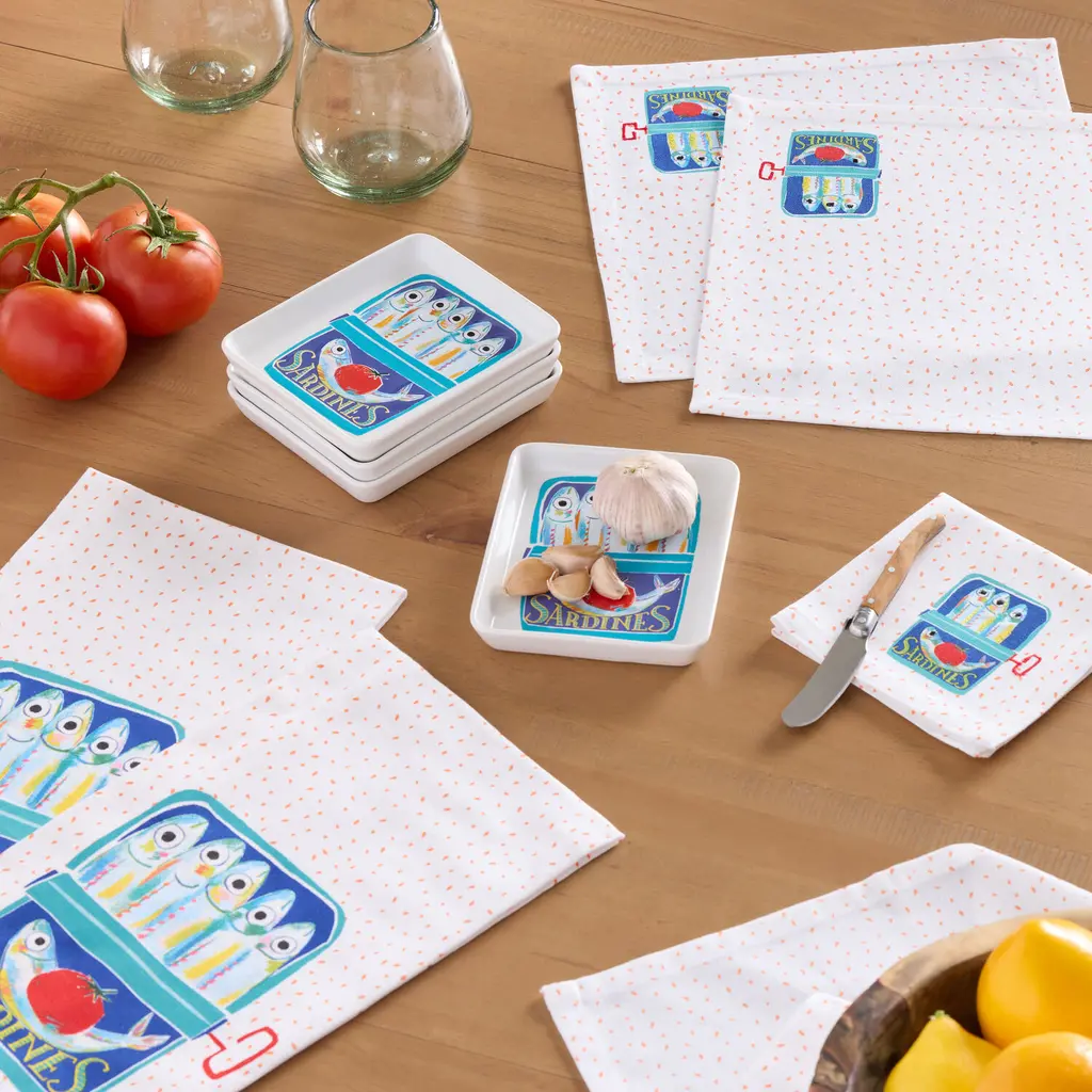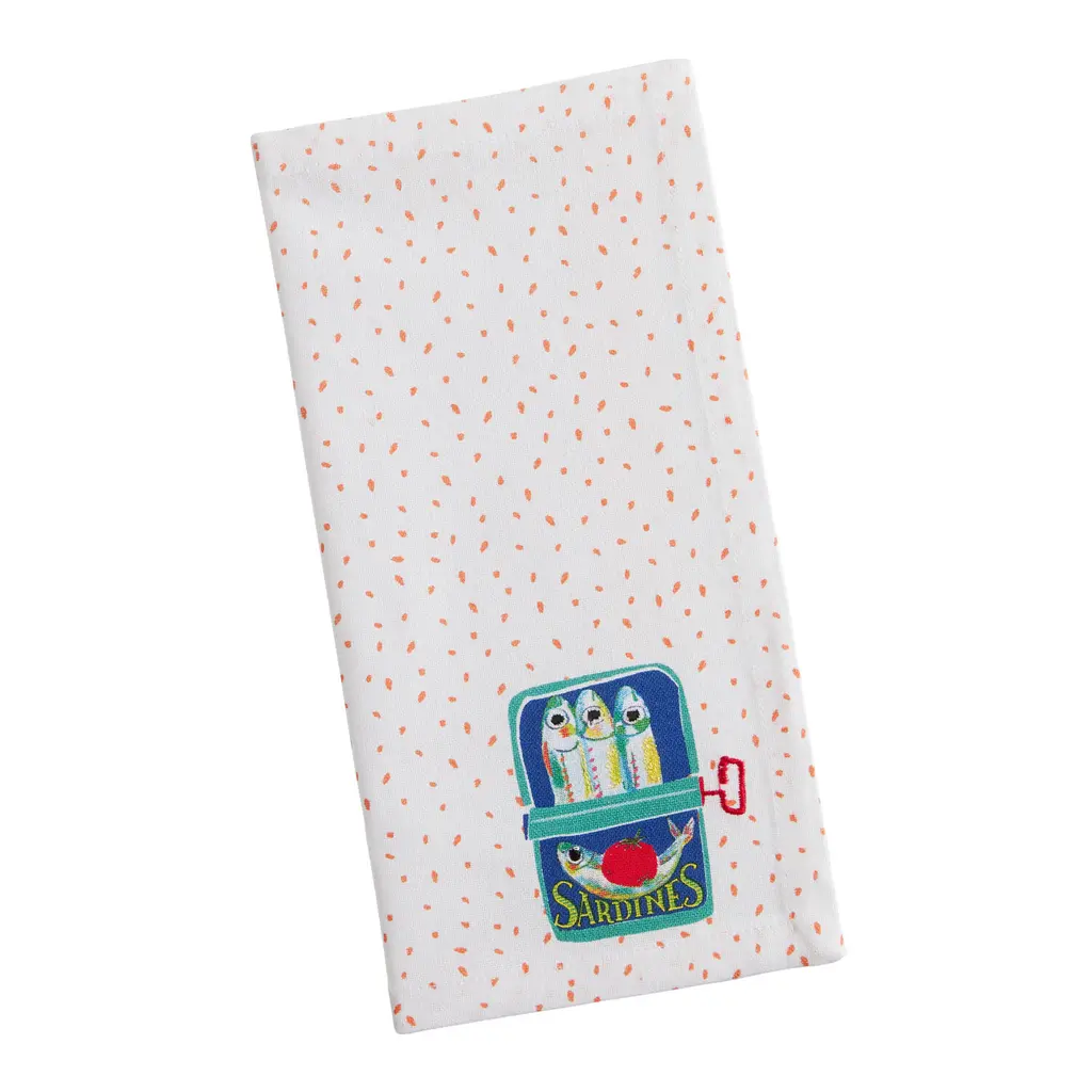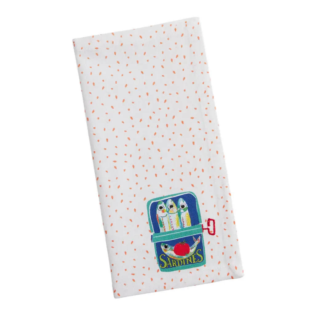 With a clean and modern look, our white cocktail napkin is flecked with red and features a printed motif of a retro-inspired tin of sardines in one corner. Made of 100% cotton, it's the perfect size for outdoor entertaining, beach barbeques, picnics and more. The fresh and on-trend design elevates your space with lively graphic style.