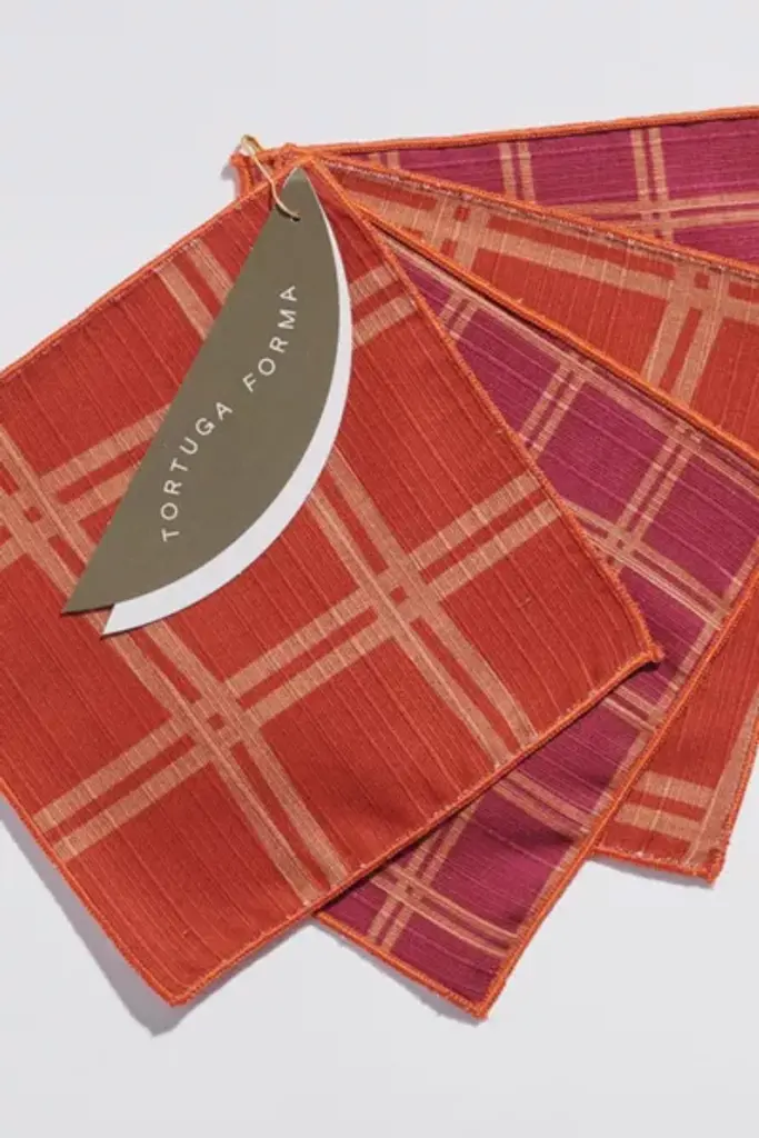 The TF Grid cocktail napkin pattern is a tipsy version of an orthogonal grid in wine and cocktail inspired palettes to camouflage spills. Framed by a purl stitched edge. Our double-sided table linens have a distinct design on the front and back where the pattern shifts in scale and the colors vibrate in surprising combinations on each side. The cocktail napkins are printed on 100% cotton shantung with a light woven texture and a luxurious touch. **Content+Care** \- Set of 4 \- 100% cotton shantung with a light woven texture and a luxurious touch \- The linens are pre-washed and steamed to set the colors, but we recommend washing them separately for the first time. \- Imported **Size** \- Cocktail Napkins: 5 x 5"