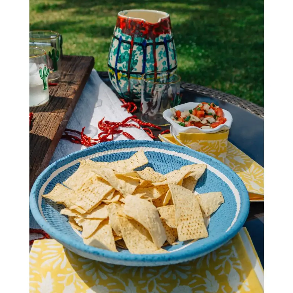 Suitable for all occasions, the blue and white hand-blocked cotton napkins present with a boho vibe for a relaxed table setting. The crimson border pattern adds fun definition.
