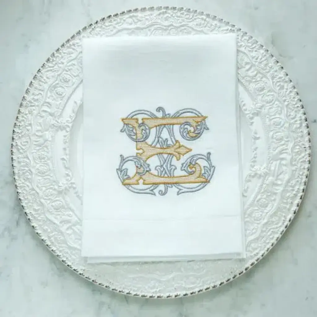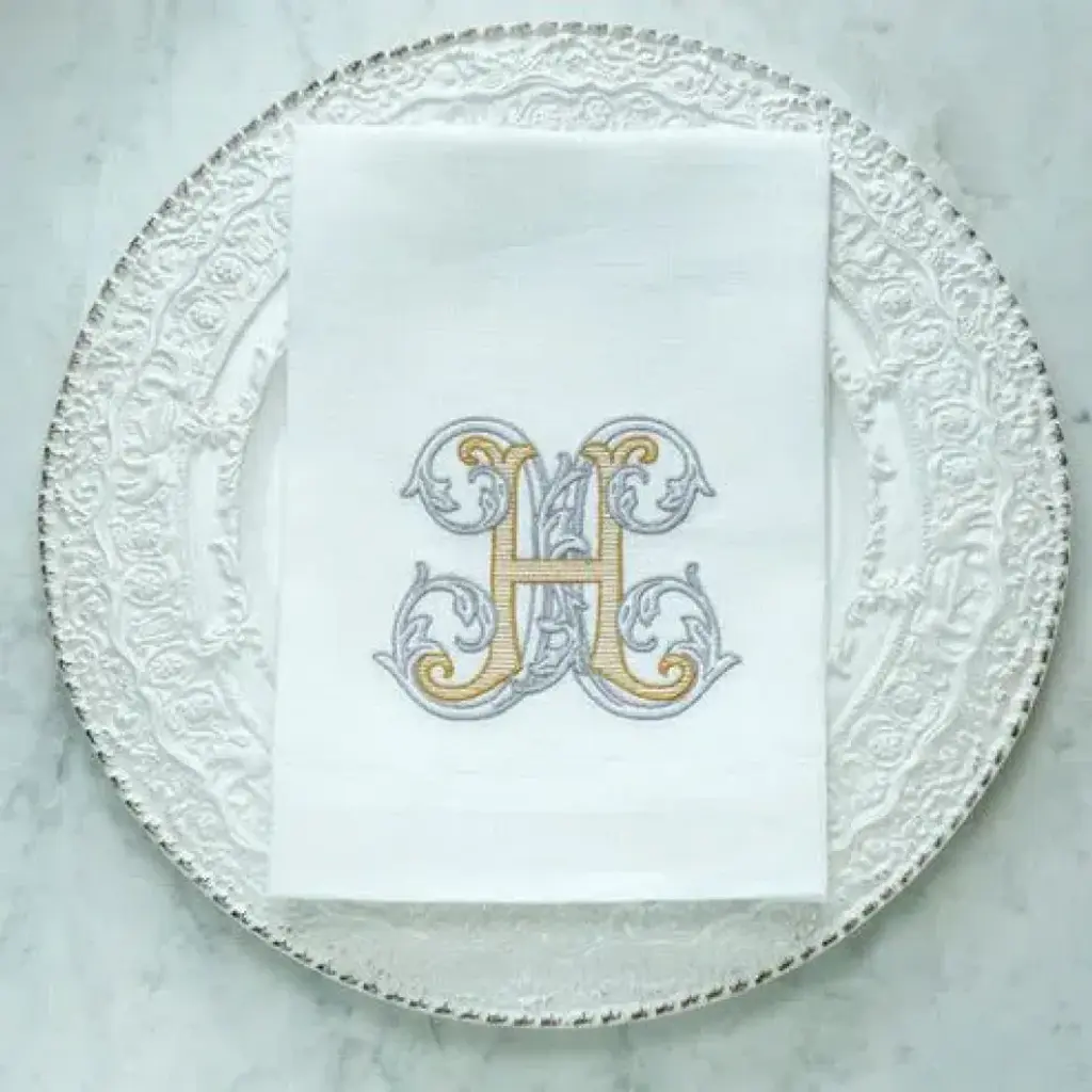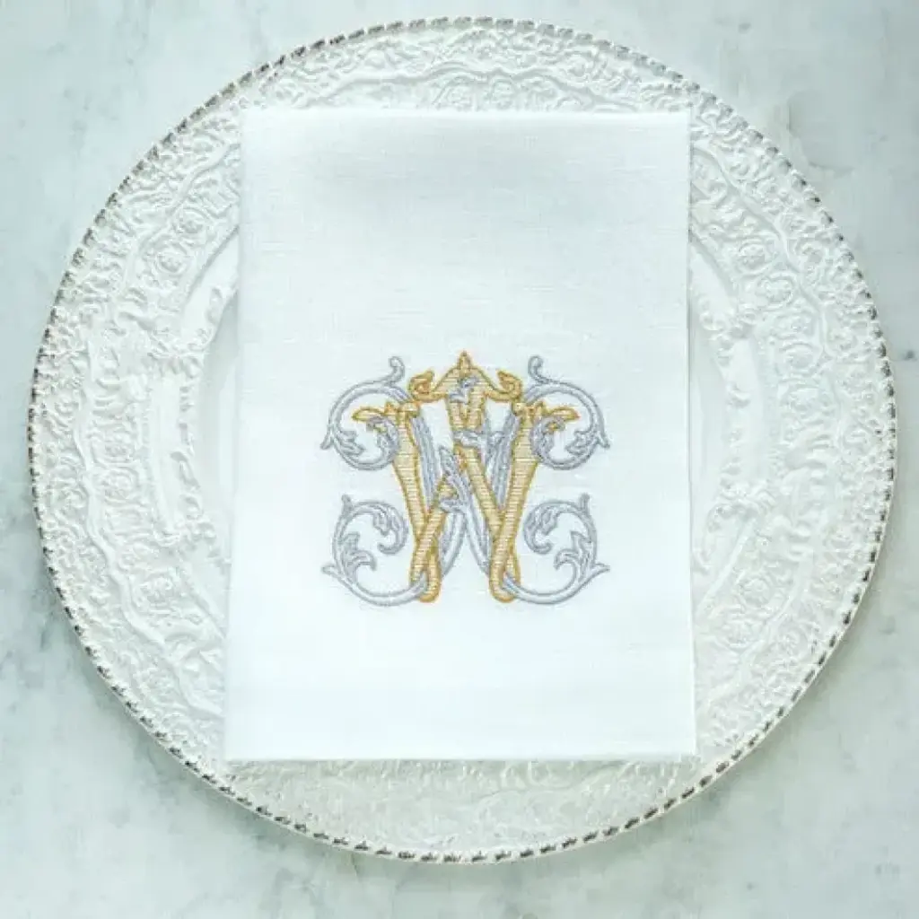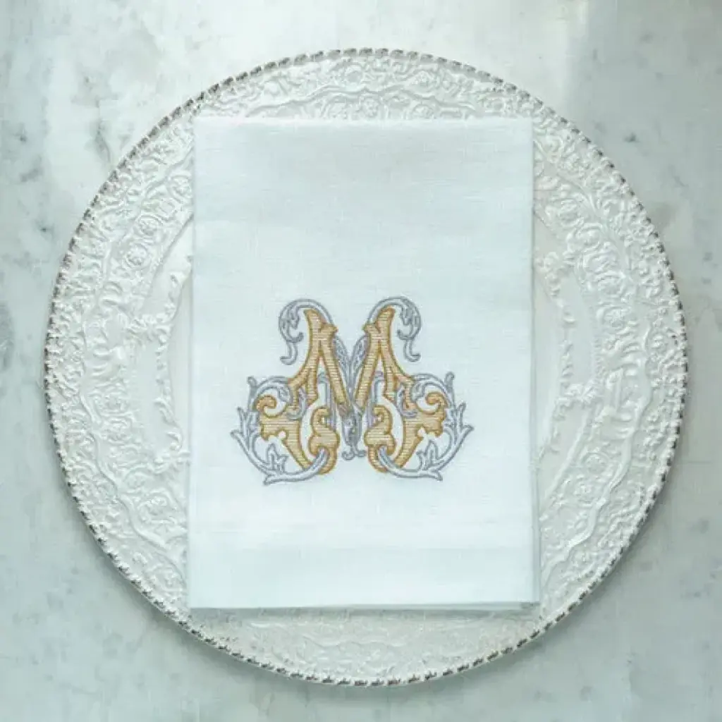 Our 100% European linen tri-fold napkin set is a perfect mix of elegance and beauty. Each napkin is embroidered with a detailed Vintage Vine monogram embroidery in the center.