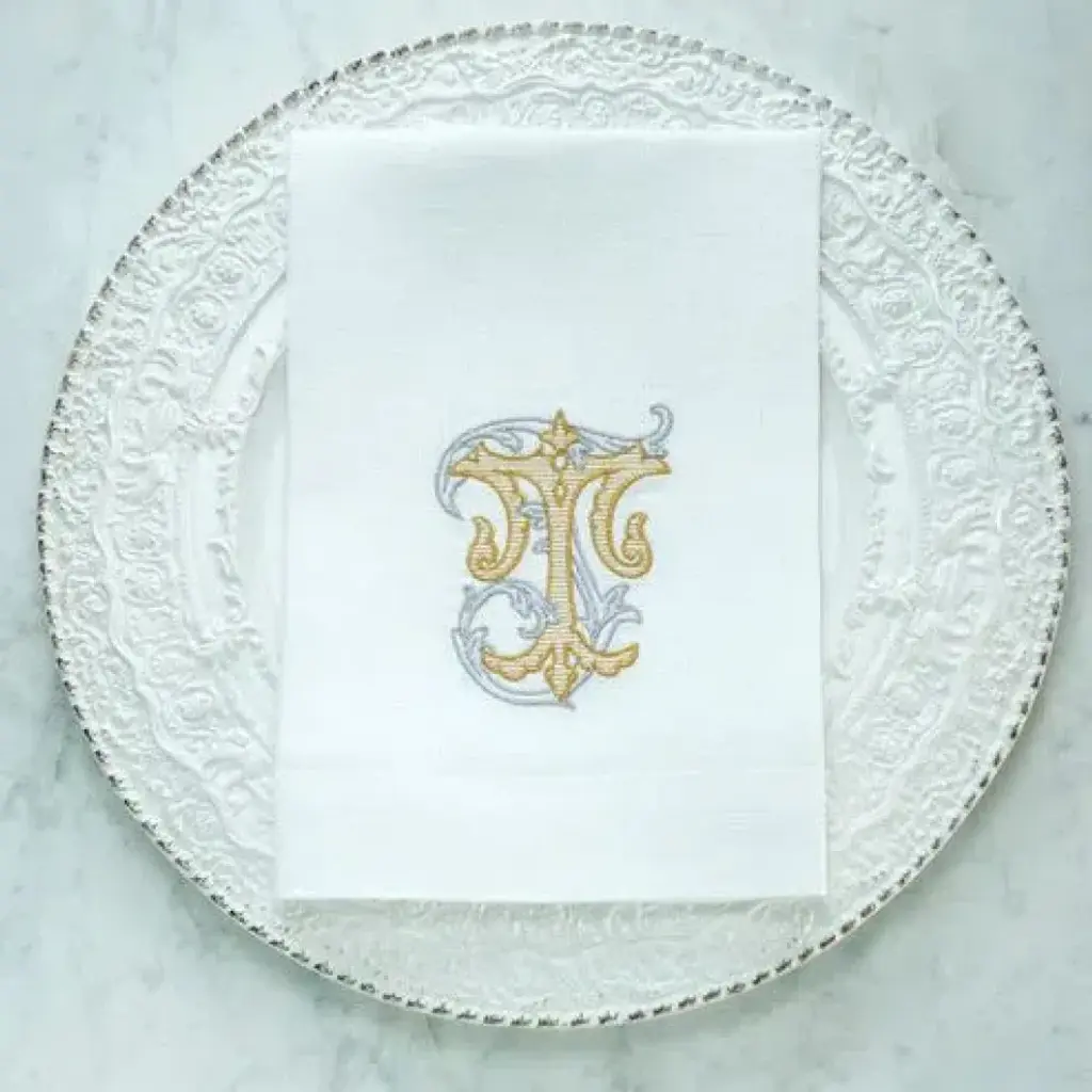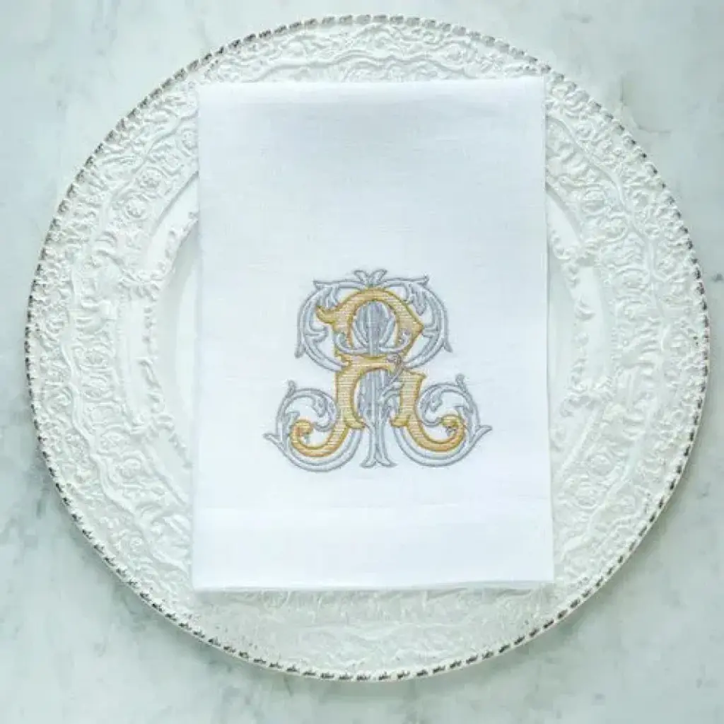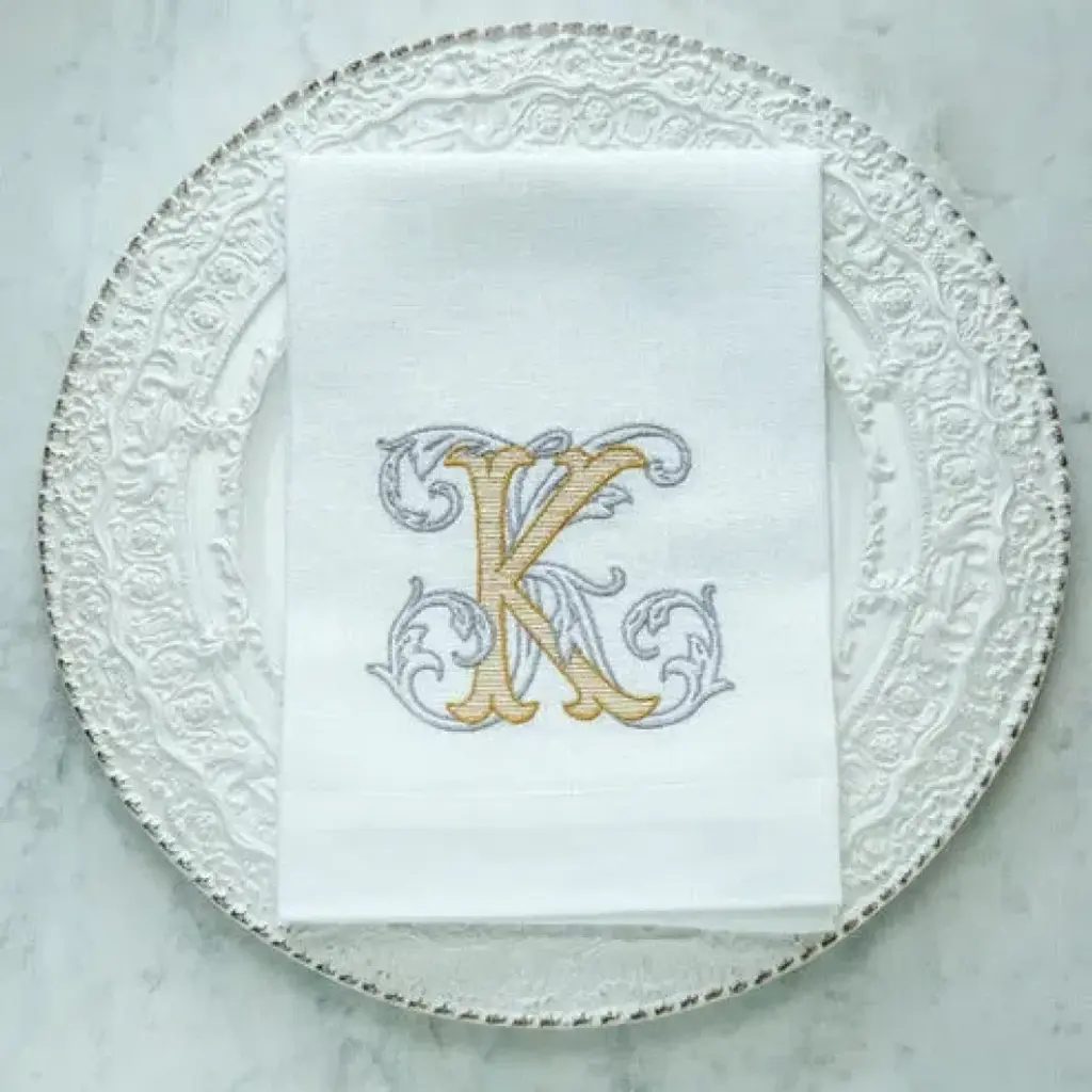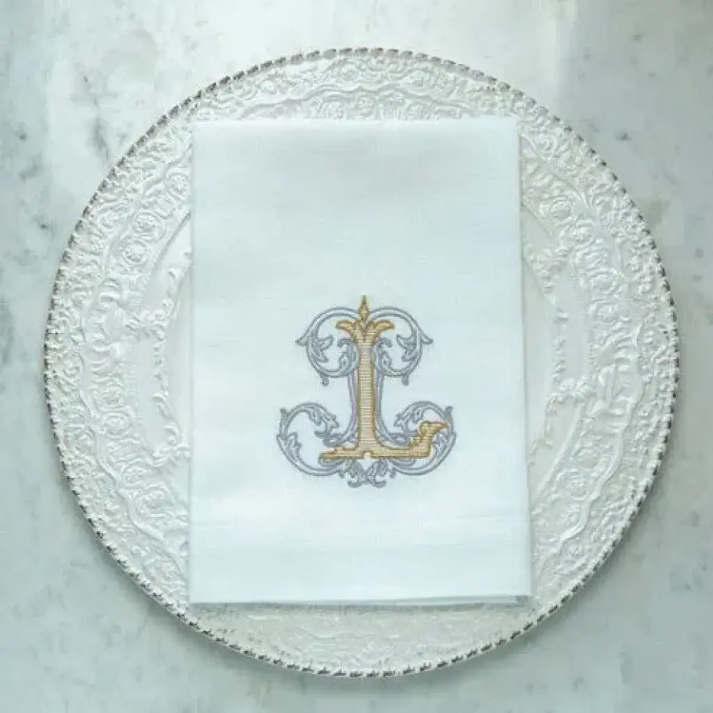 Our 100% European linen tri-fold napkin set is a perfect mix of elegance and beauty. Each napkin is embroidered with a detailed Vintage Vine monogram embroidery in the center.