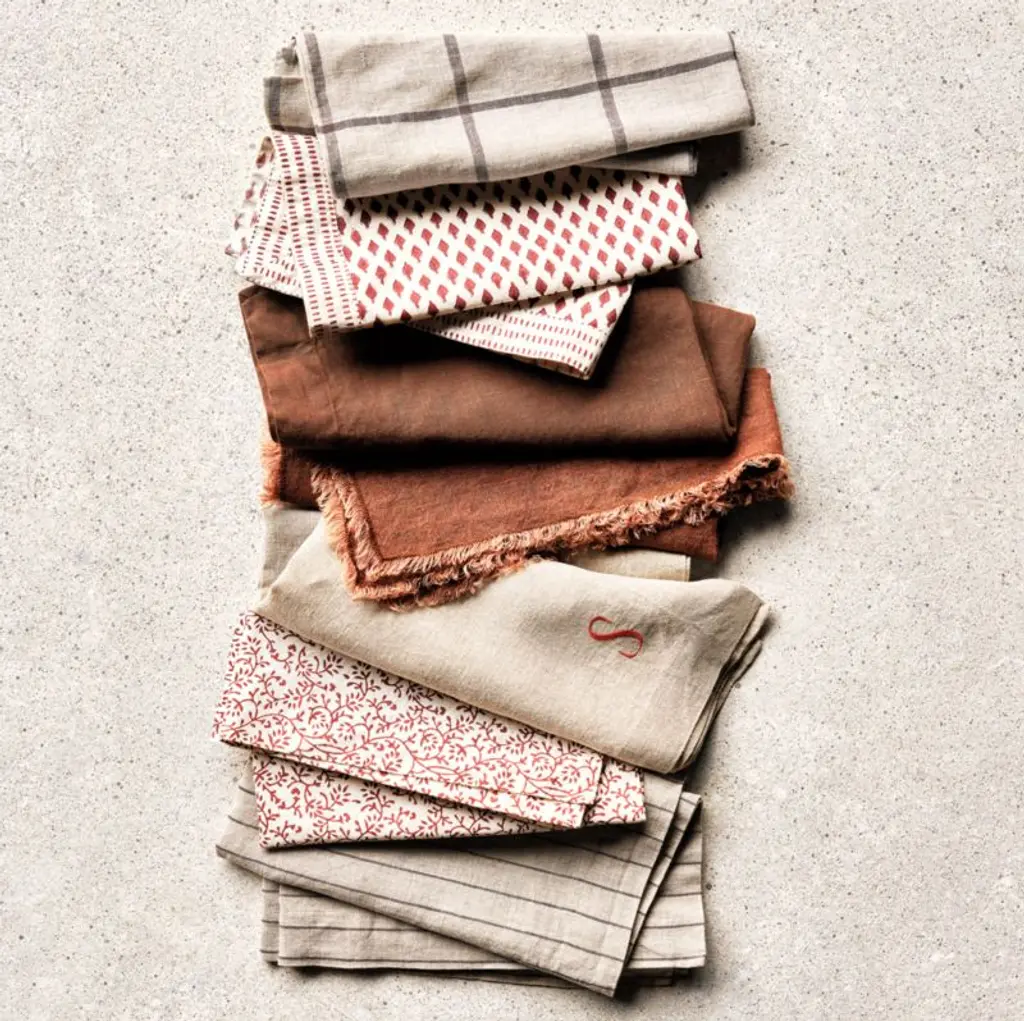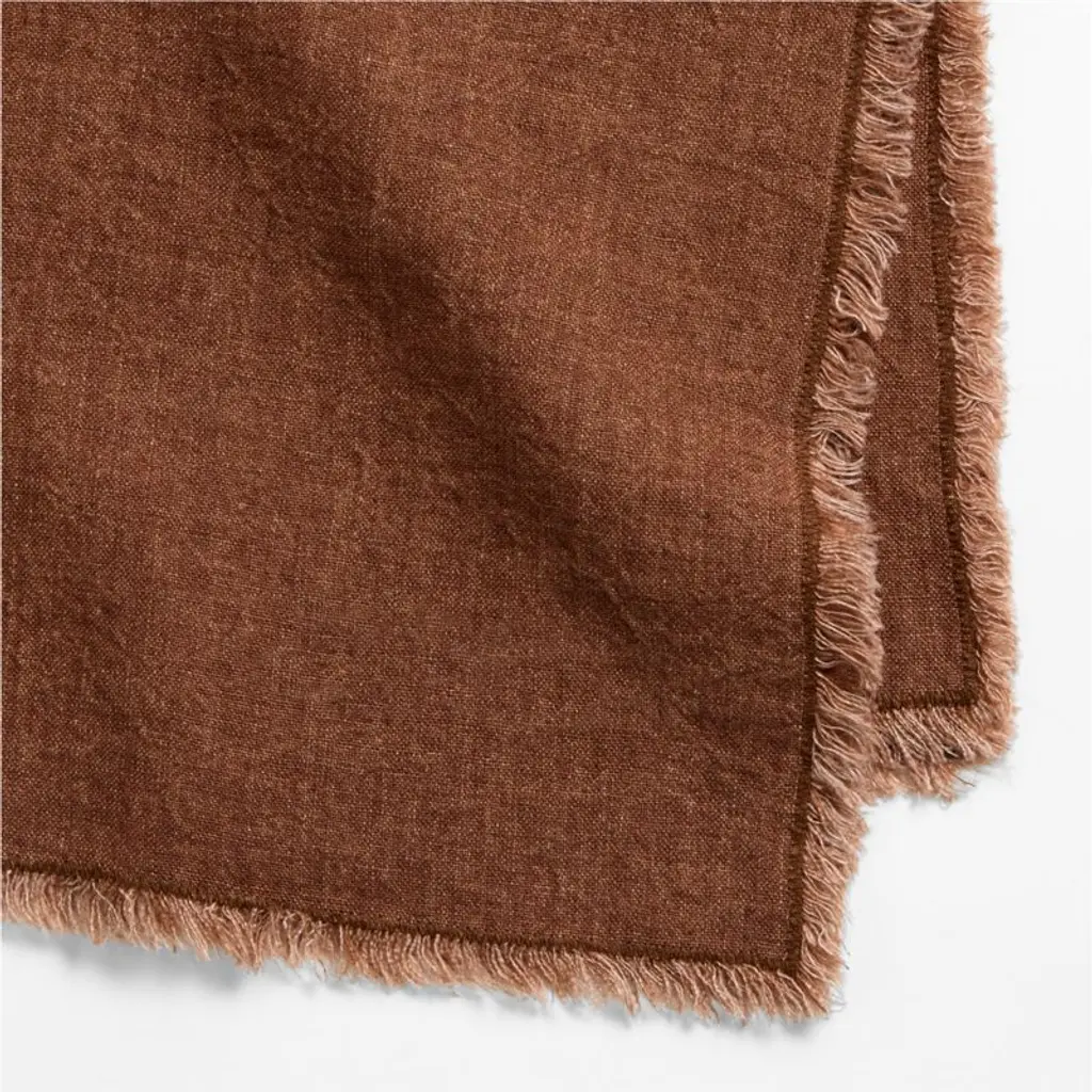Tonal variation in the warp and weft yarns gives these burnt orange napkins great depth of color. A washed finish gives each linen-cotton napkin incredible softness, and the all-round fringe adds a charming casual note.