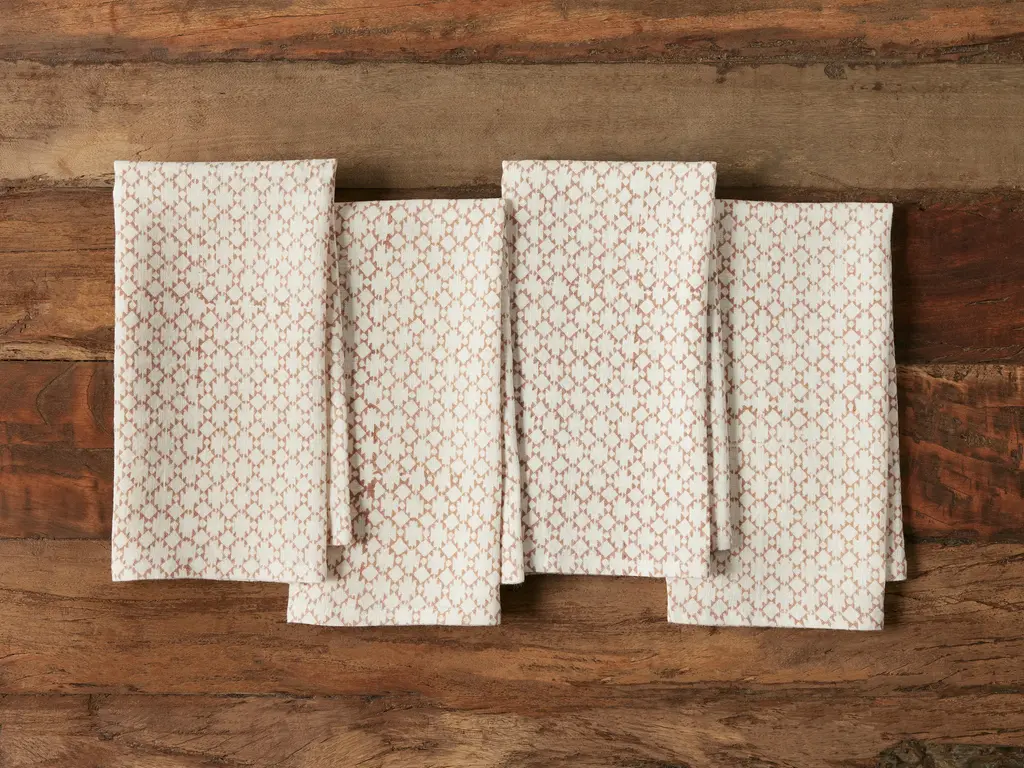 Handcrafted to capture the beauty of hand-carved wooden block printing practiced for over 500 years in Jaipur, India, our Zadie Napkins are one-of-a-kind pieces to accent your dining table. Each linen napkin features a geometric pattern with unique highs and lows inherent to the printing technique that is sure to bring a warm, rustic charm to each table setting. Crafted in India by expert artisan partners from 100% linen with hand-blocked print. Features a hem finish around edges. Designed to bring one-of-a-kind comfort to your everyday moments, this artisan-crafted piece will display unique variations in color, texture, and pattern. Exposure to direct sunlight may cause fading. Set of four napkins.
