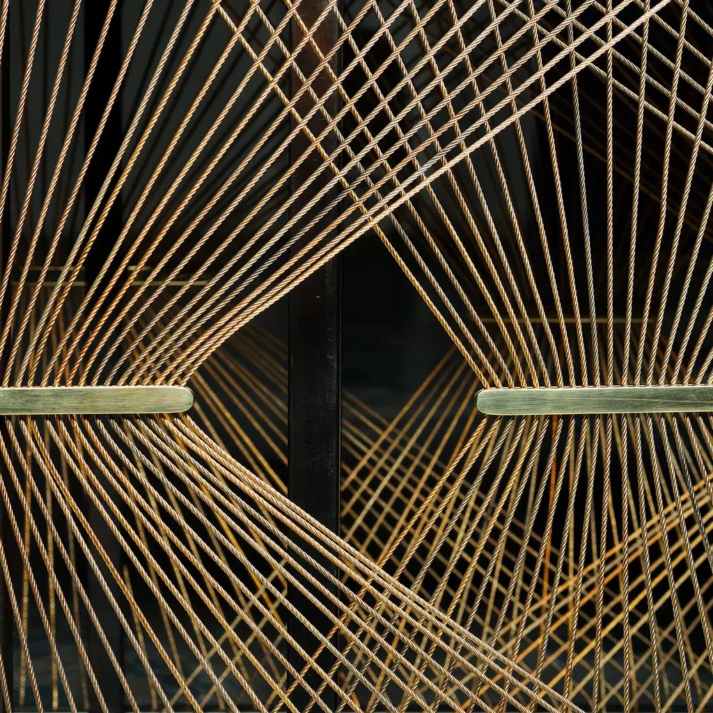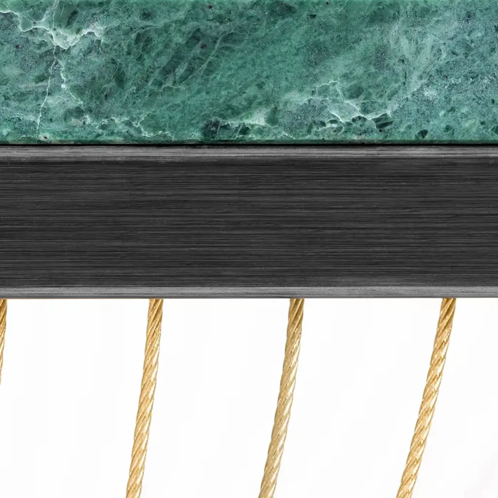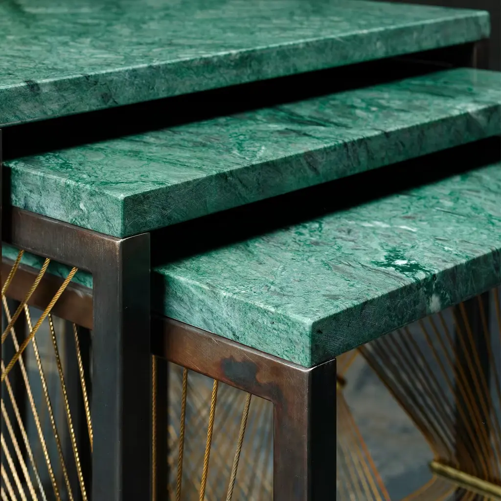 The elegant simplicity of this contemporary set of two nesting tables disguises a complex construction. An open blackened steel structure supports the green Guatemala marble tops, while on the sides gilded steel wires are held by polished brass plates in an hourglass shape. The tables measure (in cm) 48 x 56 x H 56 and 43 x 52 x H 52. They are available also individually and in a set of three with the addition of a smaller table (38 x 48 x H 48 cm). Customization of finish is available on request.