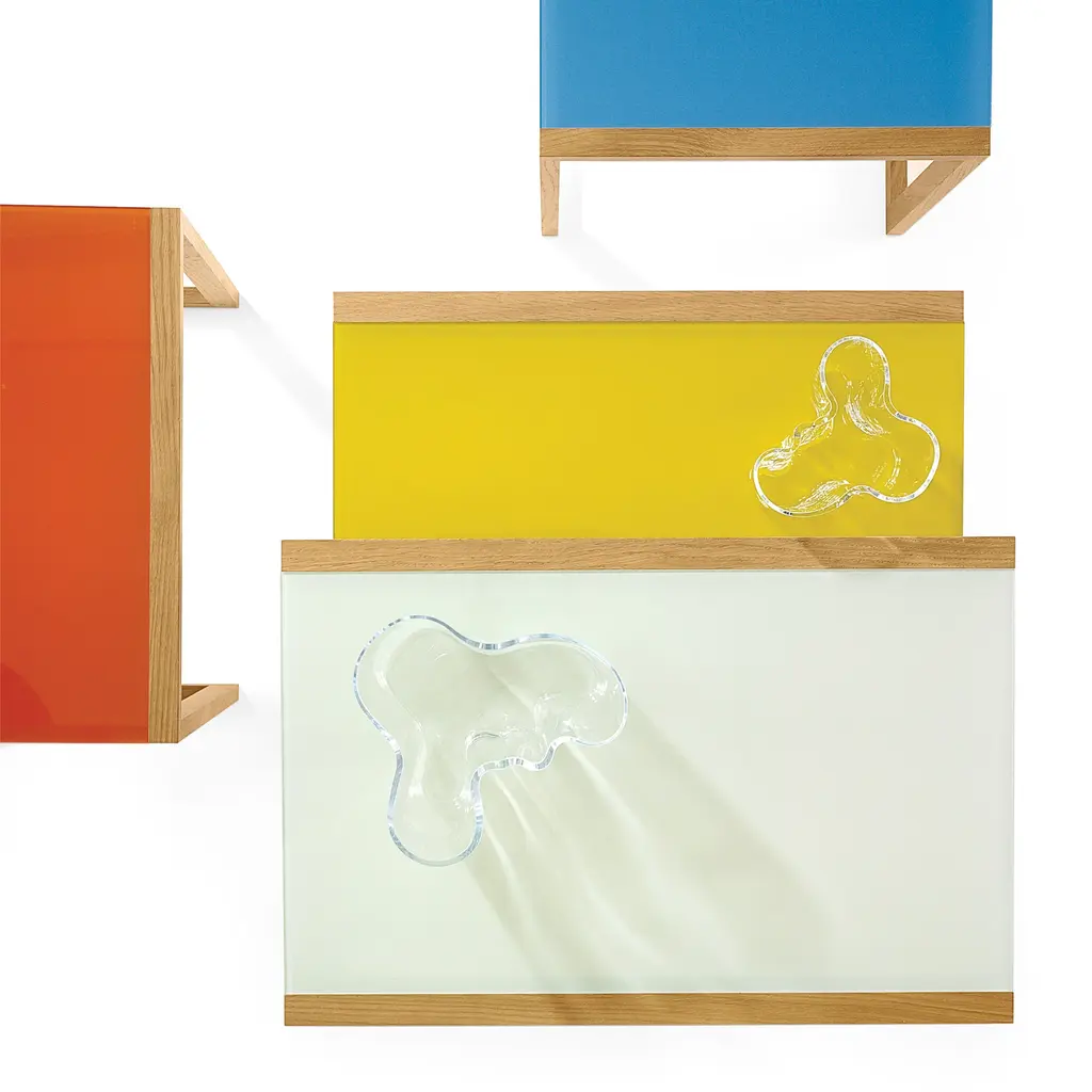 MoMA Exclusive: This set of four tables was designed by Bauhaus master Josef Albers, a designer with work in MoMA’s collection. While serving as the artistic director of the furniture workshop at the Bauhaus from 1926 to 1927, Albers conceived the Nesting Tables for the private Berlin apartment of his and his wife Anni's closest friends. Albers was known for his geometric paintings, and his logic and passion for color are applied to these tables. Crafted in Germany from solid oak with lacquered glass tops, they work “independently and interdependently.”Josef Albers, who played a leading role in bringing the modern design principles of the Bauhaus to the United States, was born in Germany in 1888. Albers is known for his compositions that explore the relationship of color through simple forms, such as the square. In 1950, Albers became the head of the Department of Design at Yale University. In 1963, he published the influential book Interaction of Color that outlined his theories about color and understanding the rules guiding visual experience.