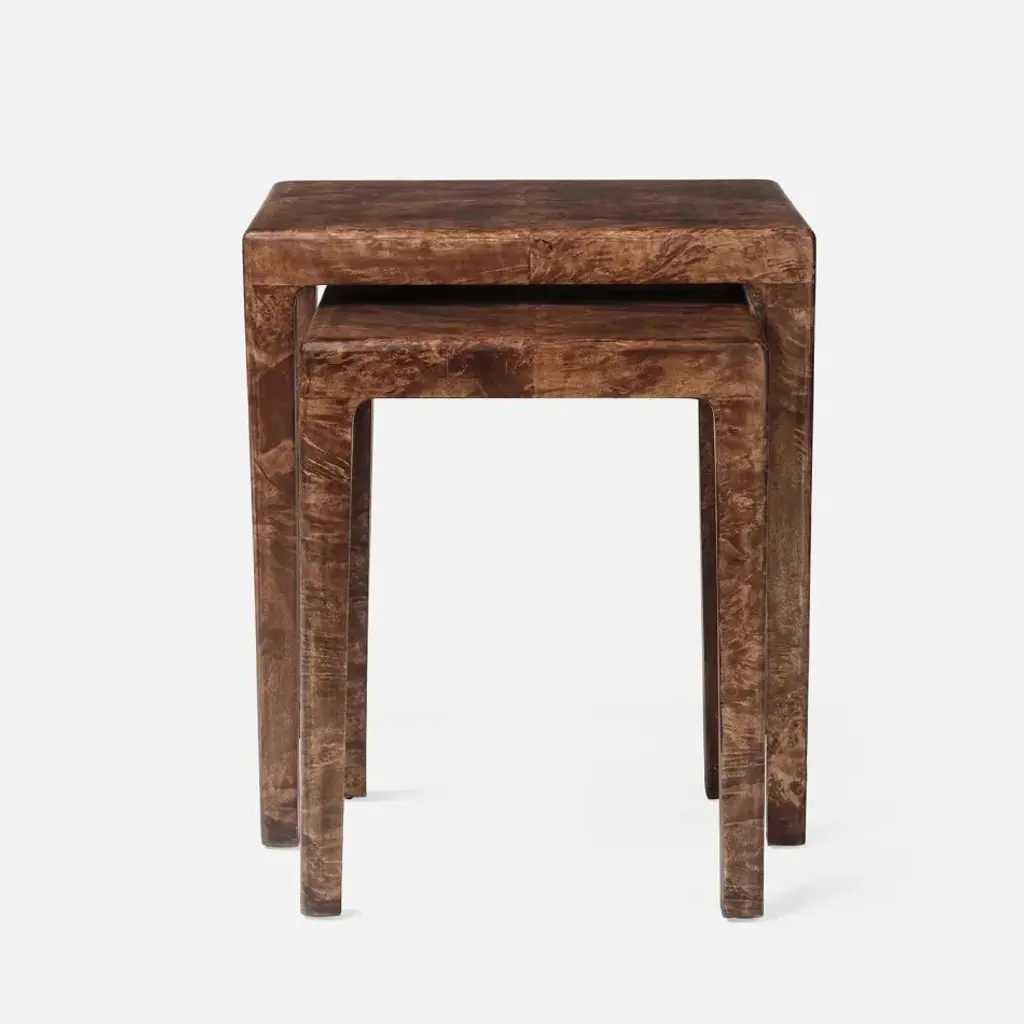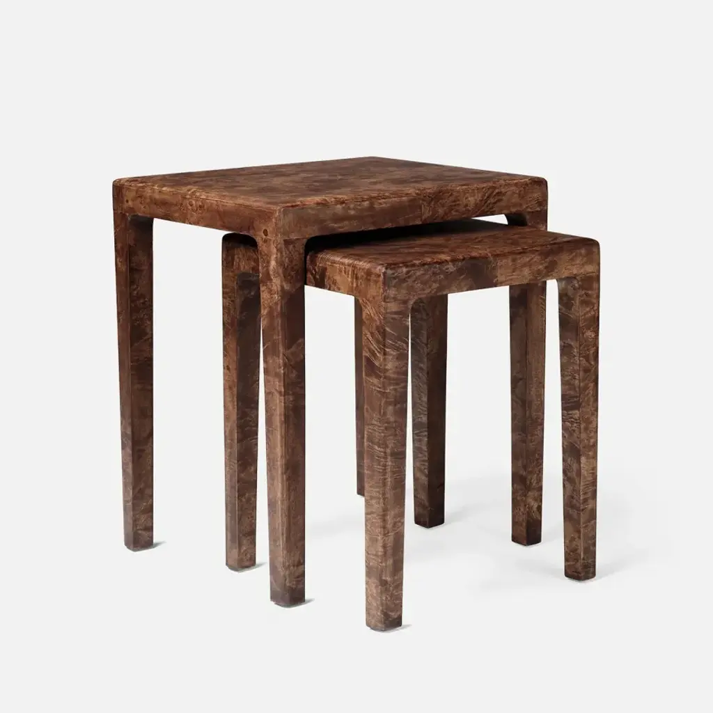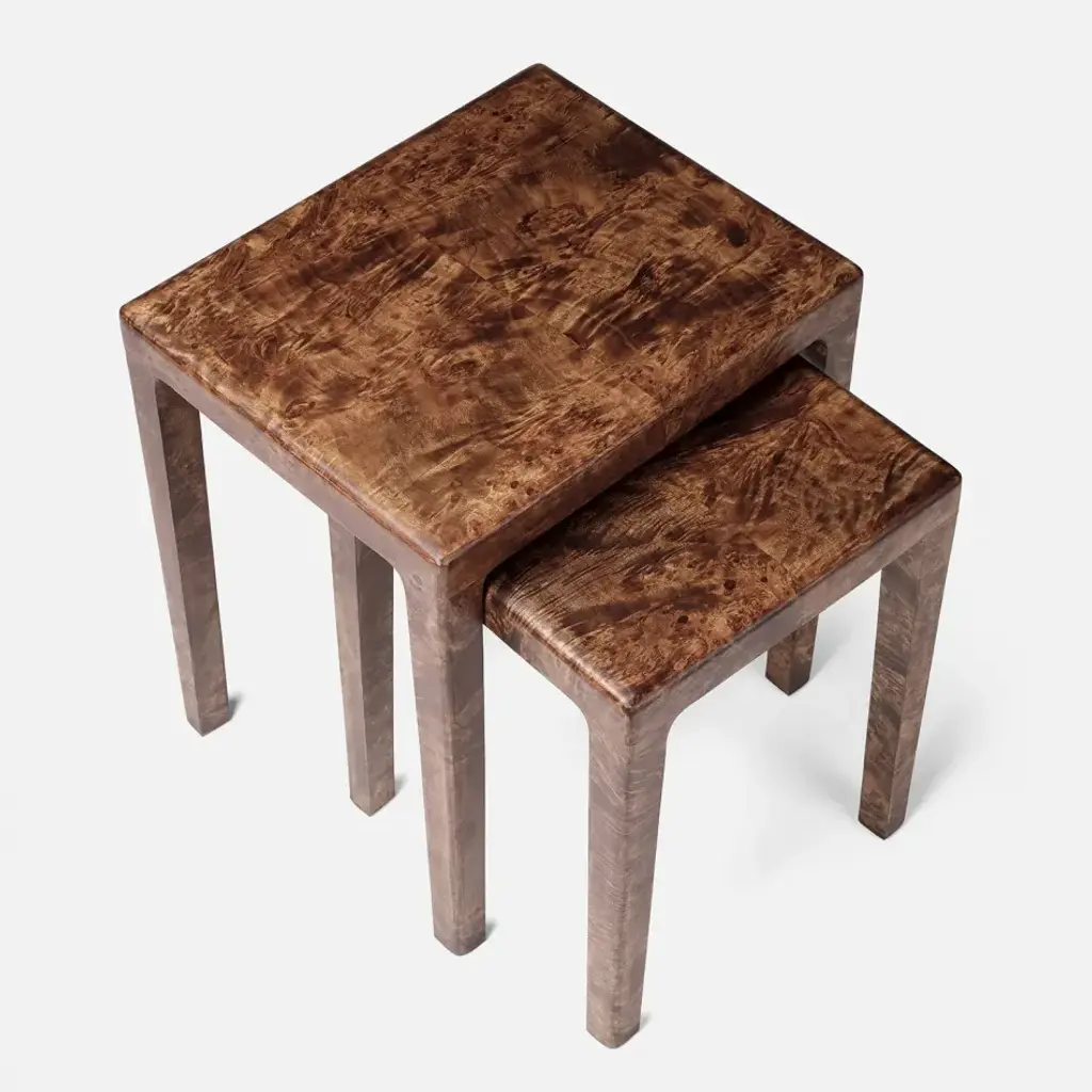 Naturally contrasting mappa burl forms the sleek, modern style of the Alessio nesting table. The intricate grain patterns add an element of texture to this naturally refined design. Given the nature of the material, subtle variations in grain patterns are expected from piece to piece.