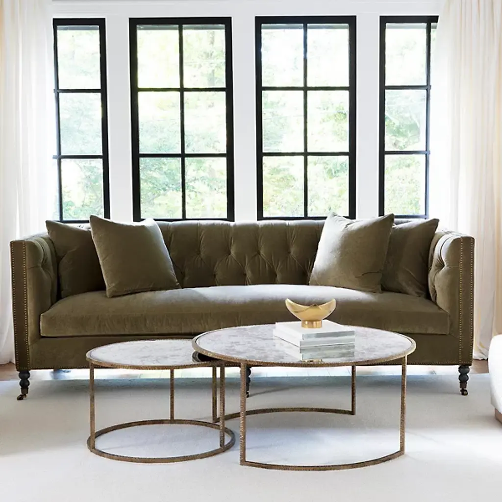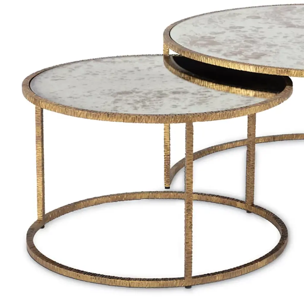The Anastasia Nesting Cocktail Table from Regina Andrew is a stunning addition to any gathering space. Handmade in India with uniquely textured metal bases in a lustrous gold finish and antiqued mirror glass tops, this set of tables creates glamour and sophistication. The distressed details add an alluring intricacy, making it a chic accent piece with luxe lines. The layered design embodies a transitional style, seamlessly blending classic and contemporary elements with effortless ease.