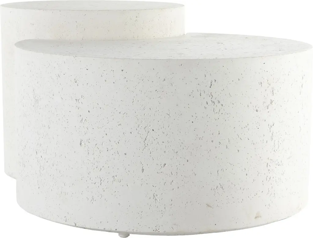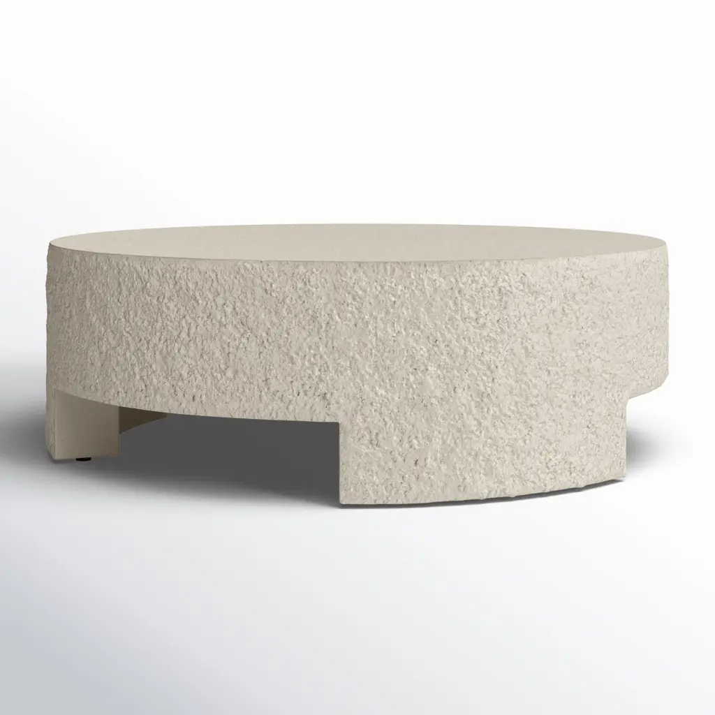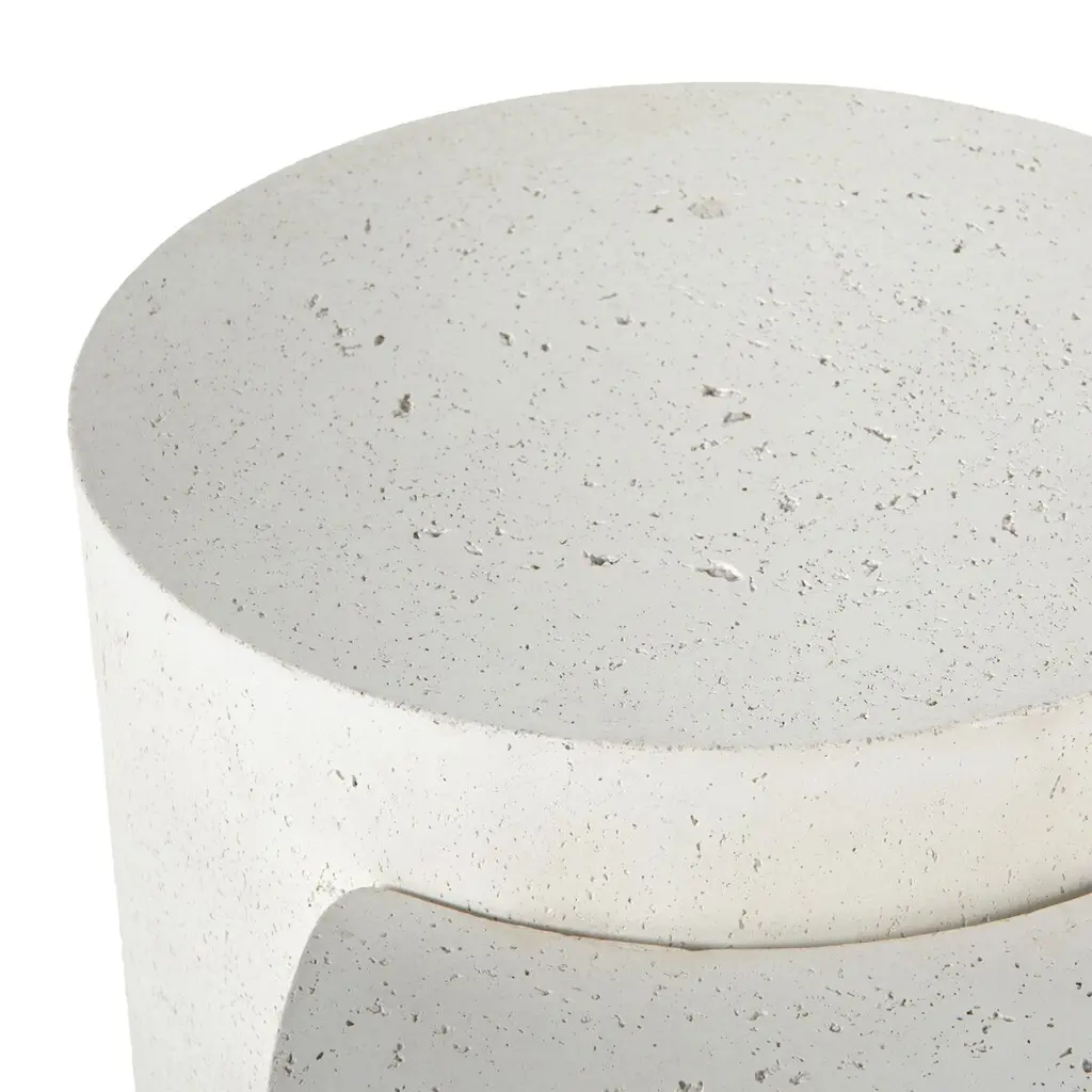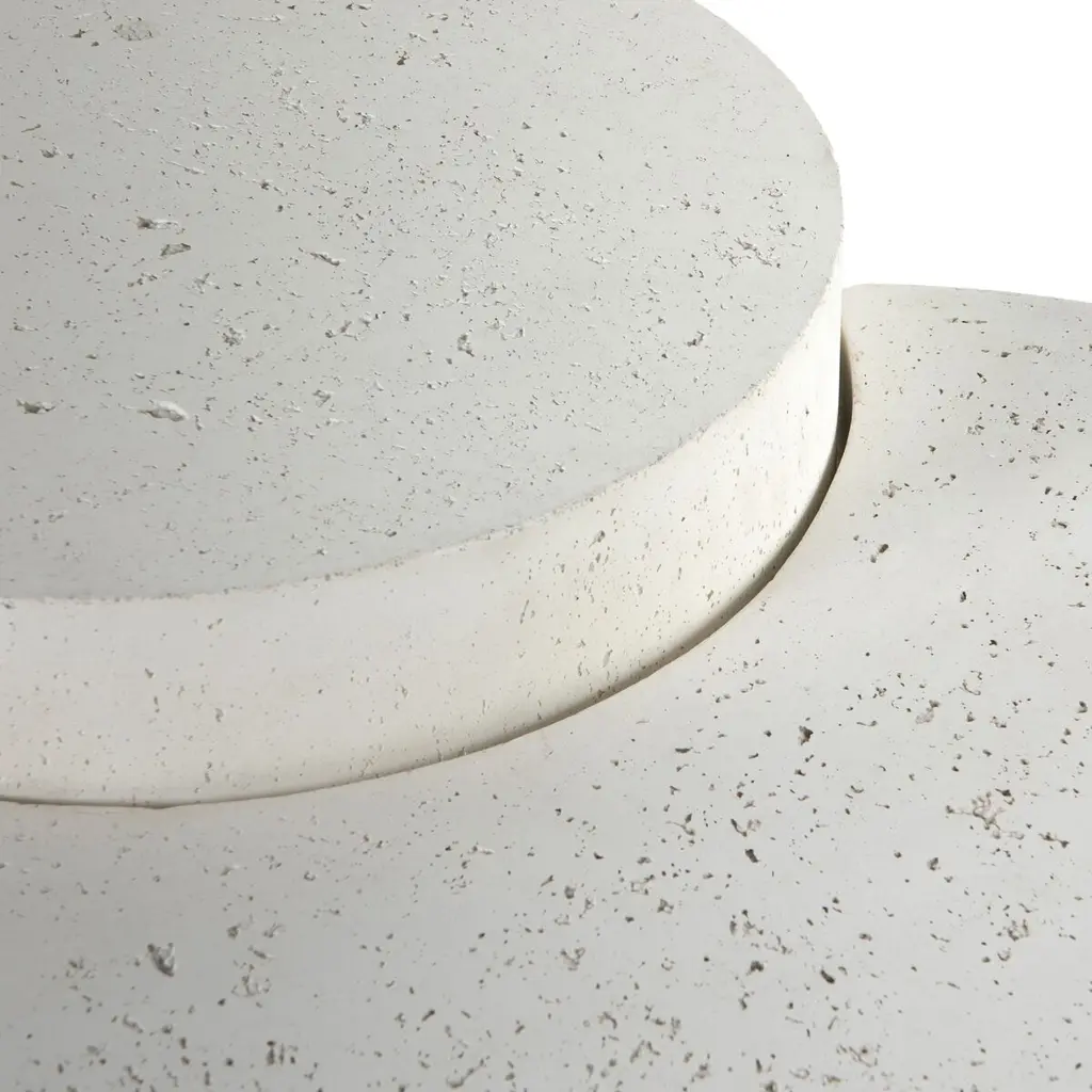 The surface of this two-tier concrete cocktail table is artfully pitted to provide a textural contrast to its sleek curves.