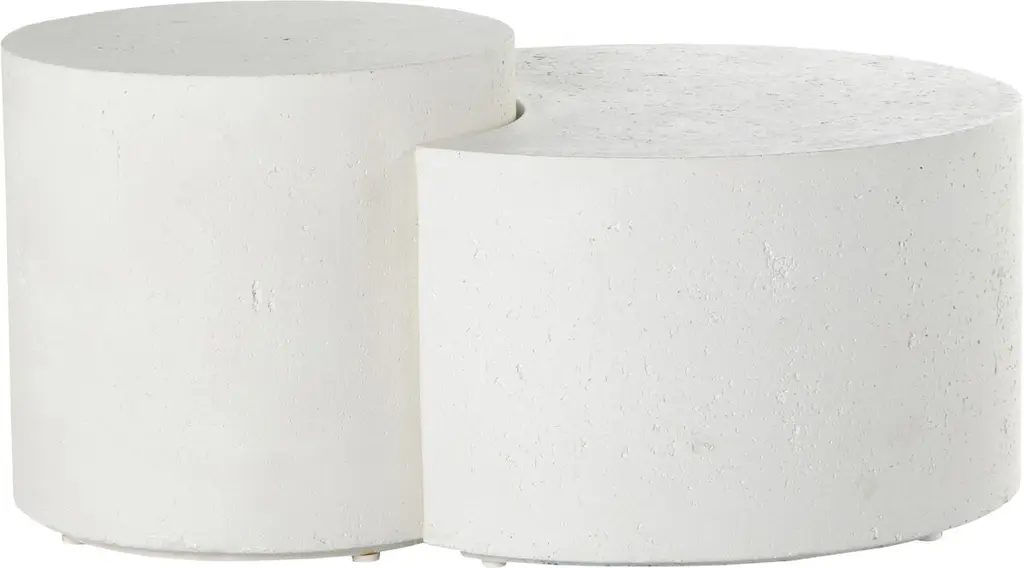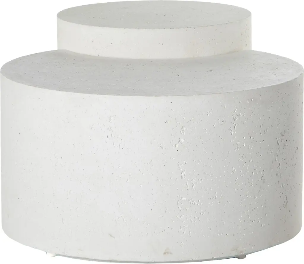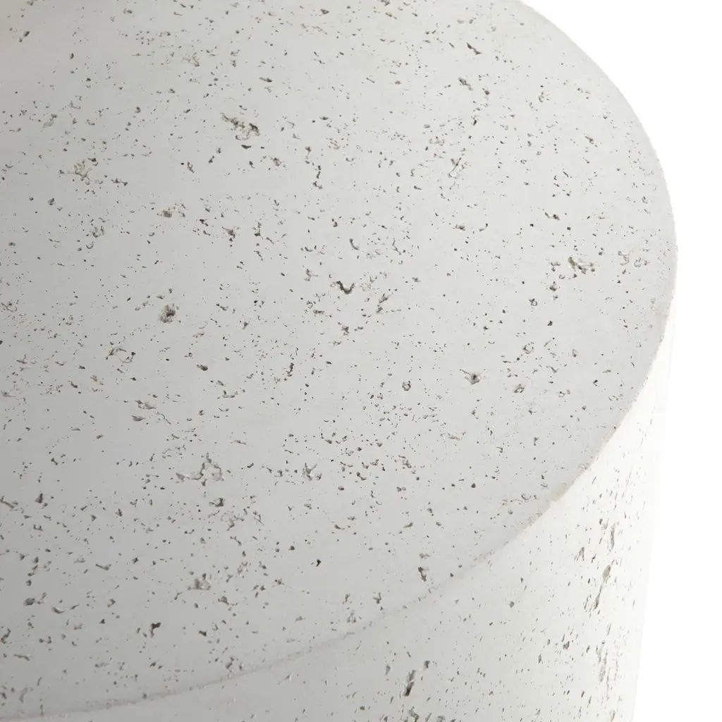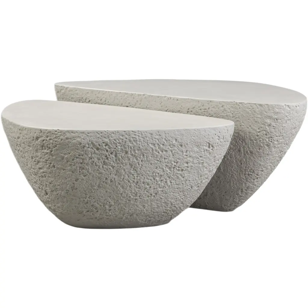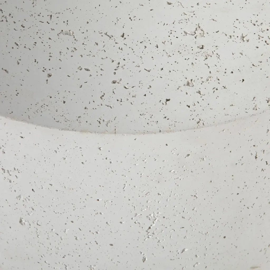 The surface of this two-tier concrete cocktail table is artfully pitted to provide a textural contrast to its sleek curves.