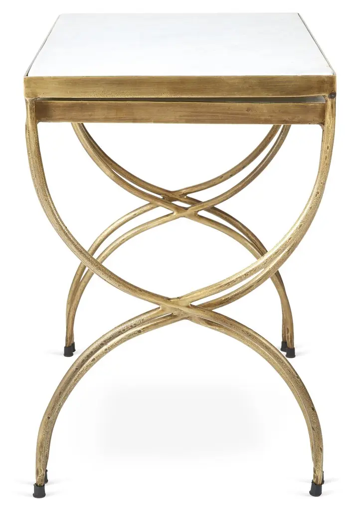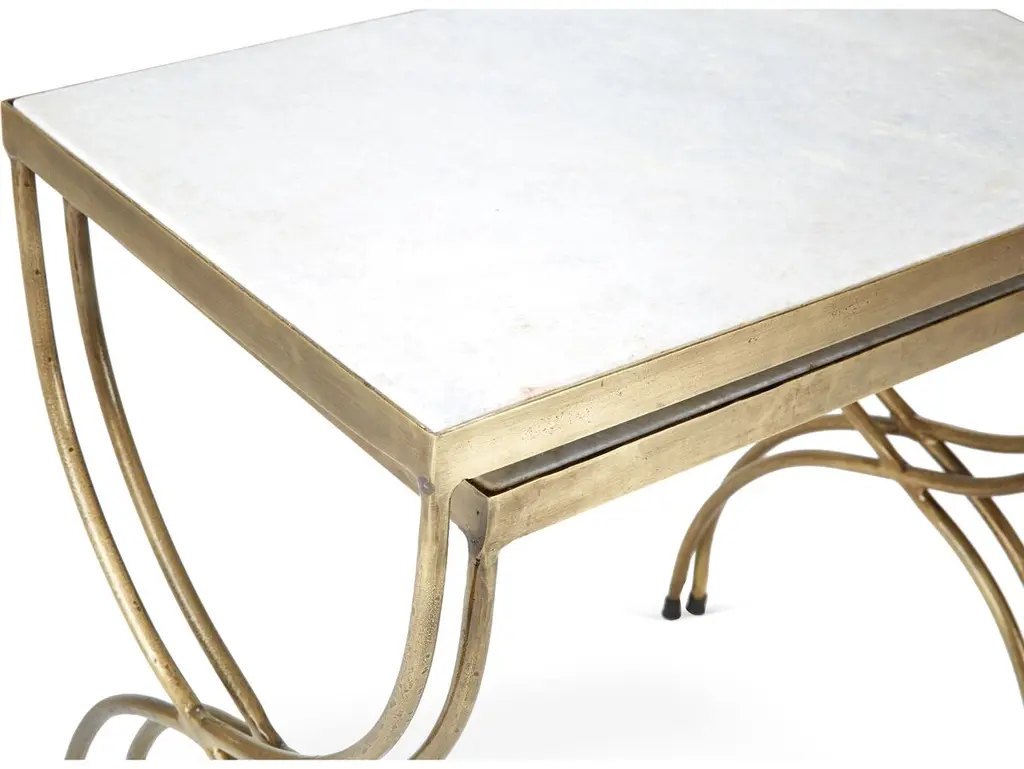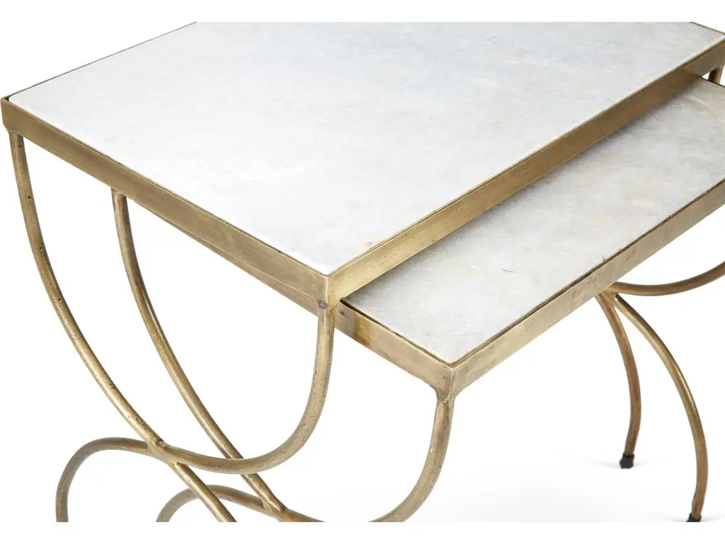 This pair of nesting tables features a brass-and-marble finish that lends a timeless elegance. Crafted of iron and marble, the classic tables are sturdy and functional.