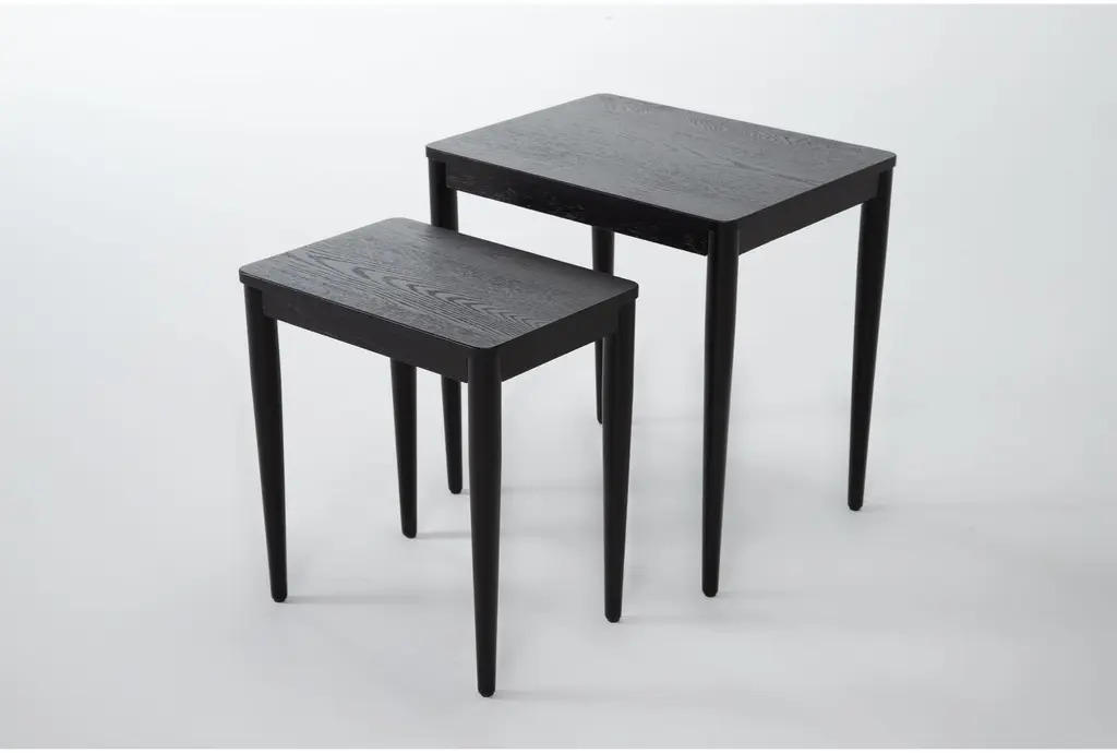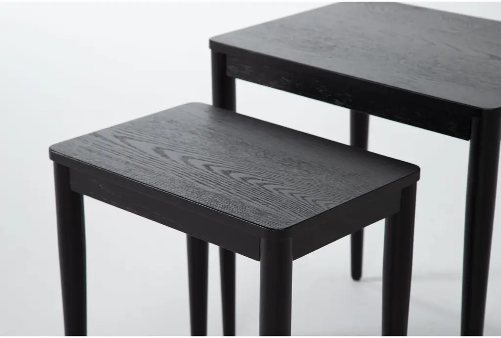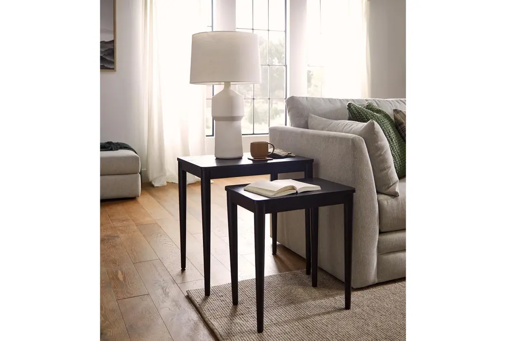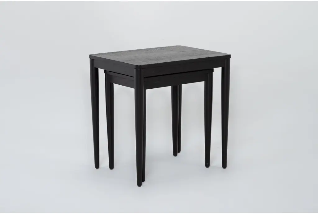 As part of a complete whole-home collection that was developed entirely by Living Spaces, the Austen 2-piece nesting table set reflects a unique and thoughtful approach to design. With a refined all-American look and extensive functionality, this set is a natural and purposeful addition to your room. A textured black finish accentuates oak veneer and solid wood, while elegant turned and tapered posts distinguish the frames. Made for versatility, flexibility and space efficiency, you can use the tables together to maintain a smaller footprint or separately to add more usable surface. This design also serves as the perfect bedside table.