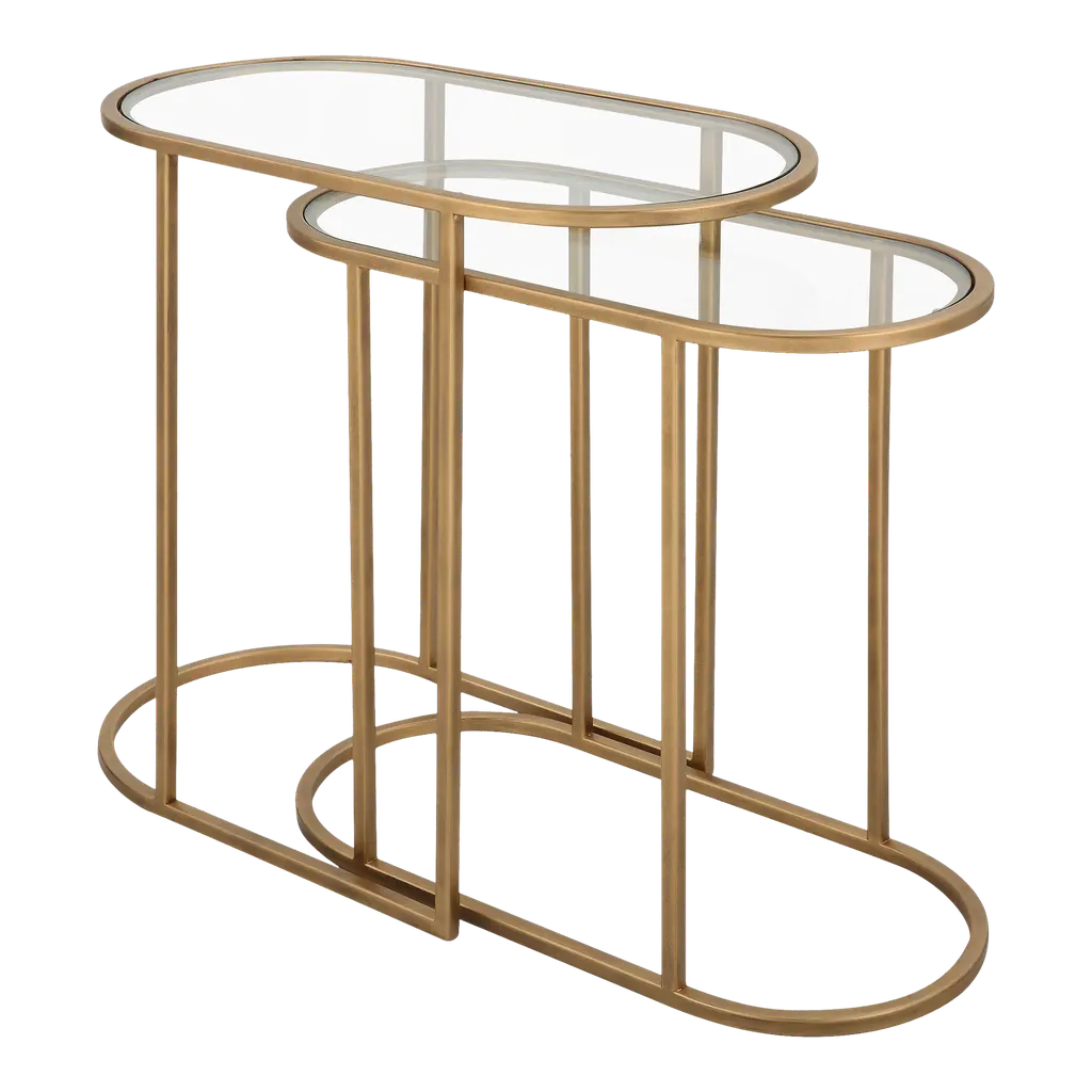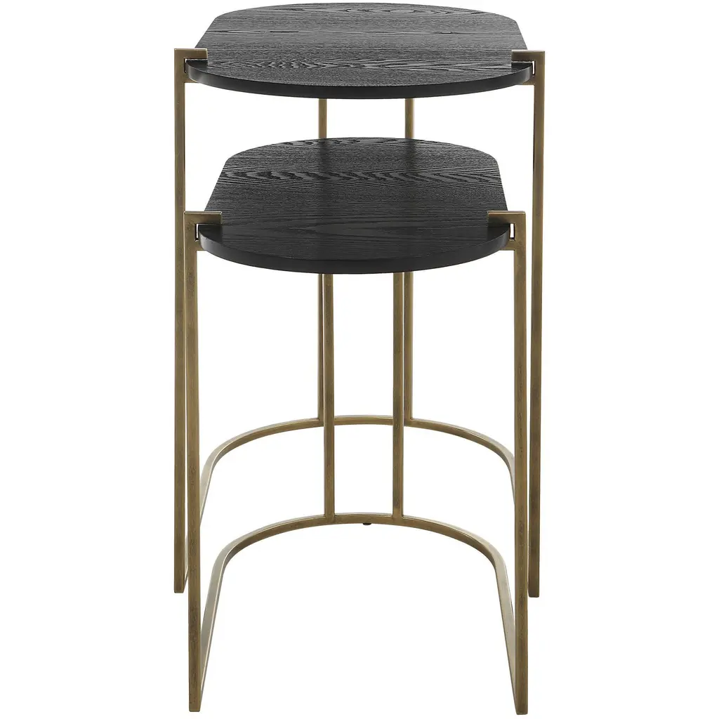 The Aztec Tables Are Crafted With Iron Frames In Antique Brass, Encapsulating Oval Tops In An Ebony Stained Ash Veneer. Sizes: S-22"x11"x18", L-27"x14"x22"