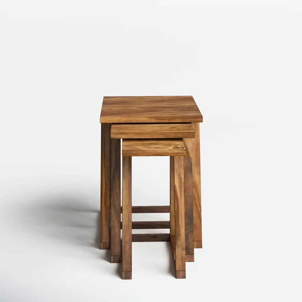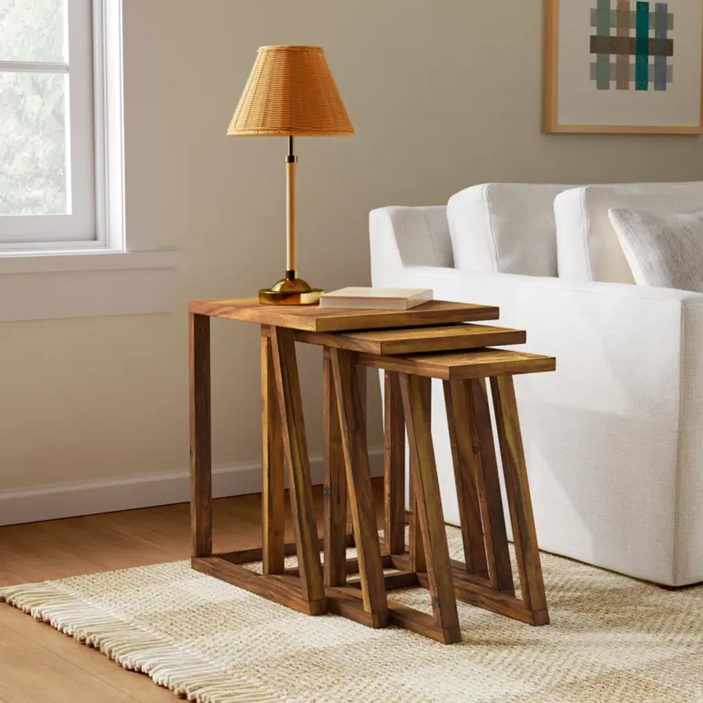 Bring minimalist, modern style to your sofa’s side with this three-piece nesting table set! Crafted of solid Sheesham wood in a nutmeg brown stain to showcase the wood exotic grain, each table strikes a clean-lined rectangular silhouette on an angular sled base. This trio can be pulled out quickly for entertaining, and easily nests for space-saving storage.