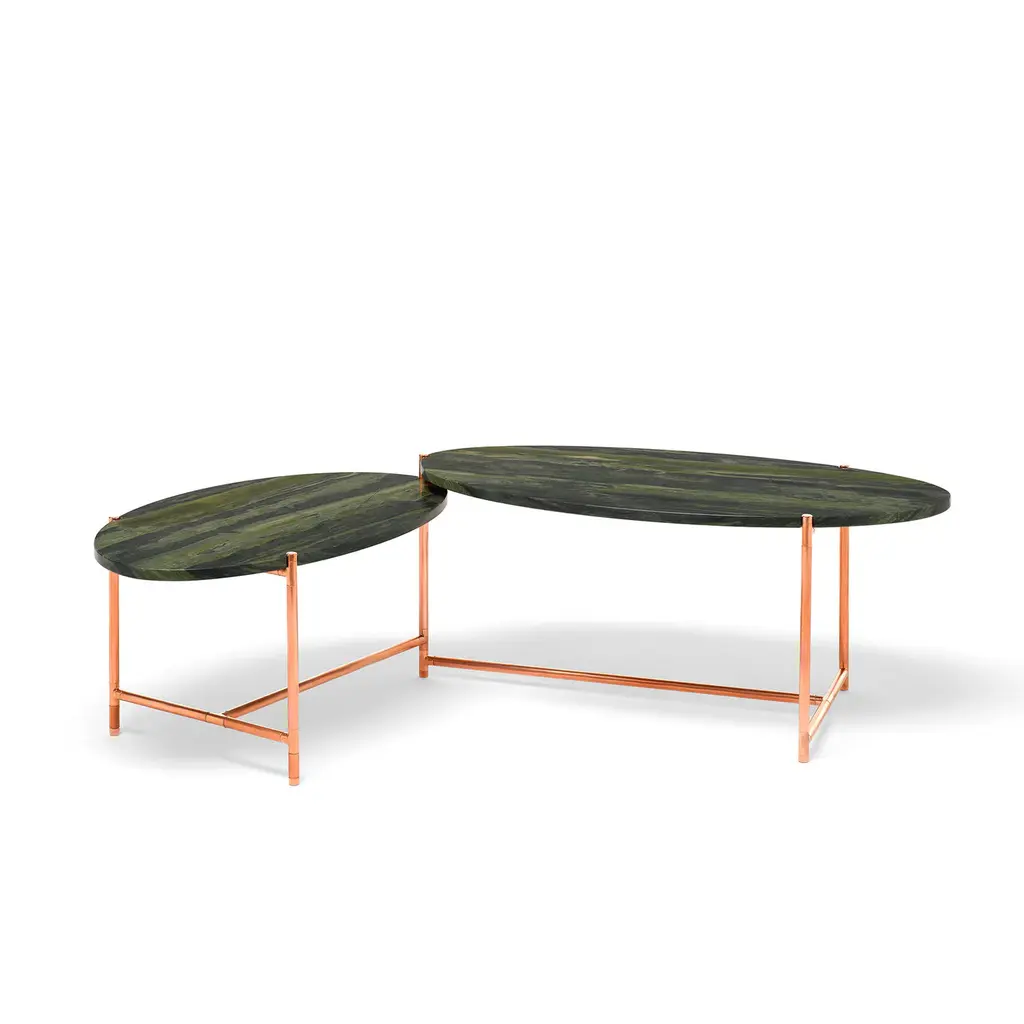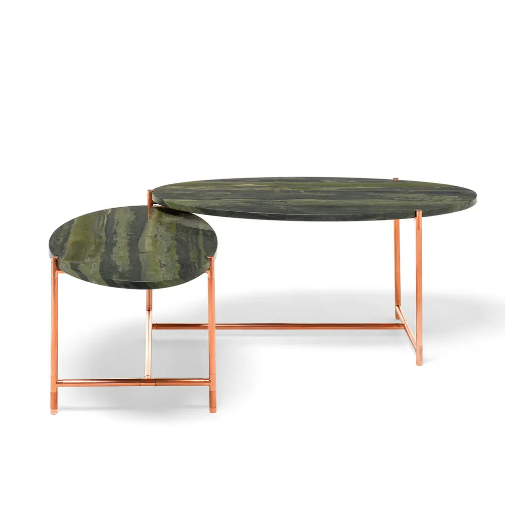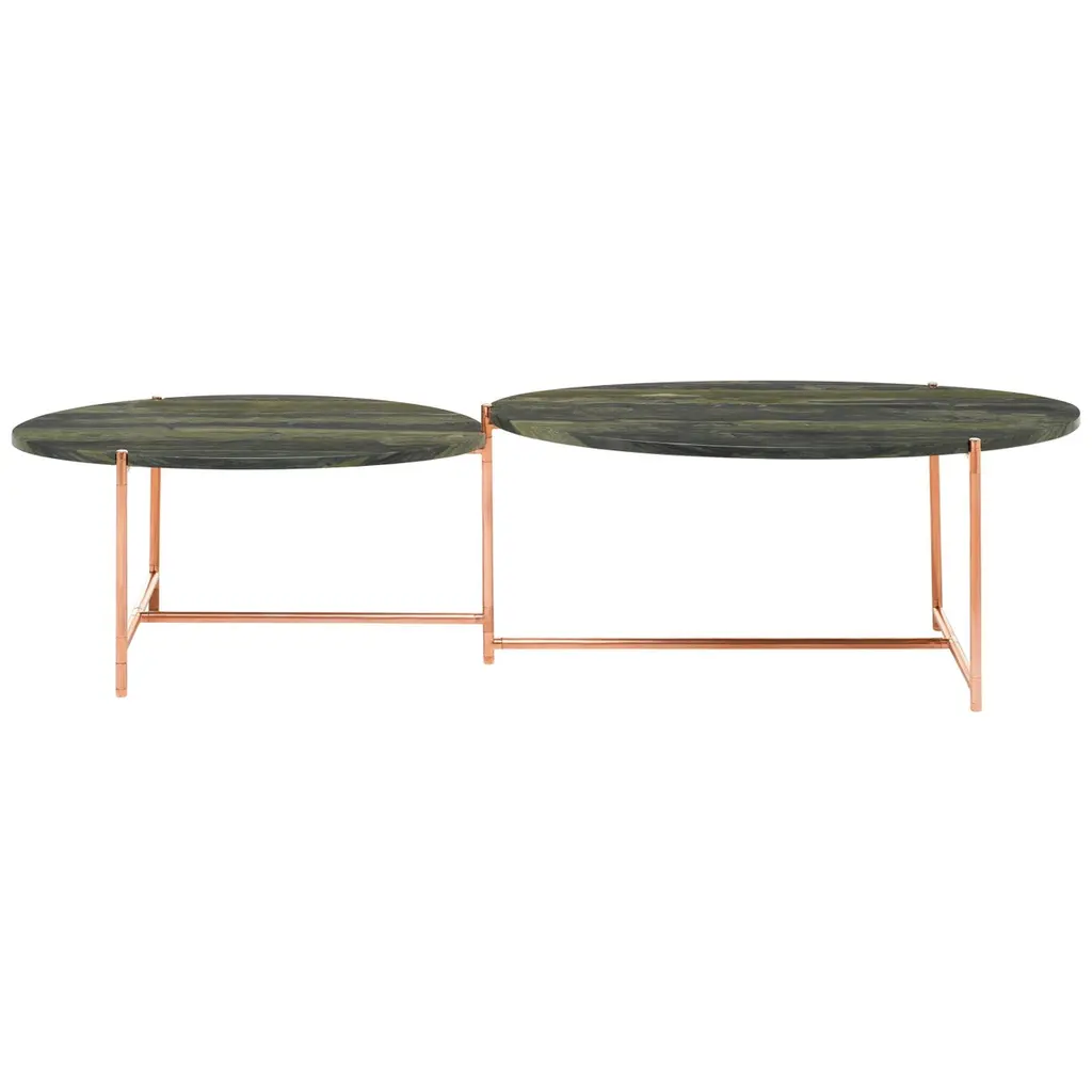 The original Big Sur coffee table features two tops that rotate around a central pivoting point so the table can expand and contract its usable surface. The elegant structure made of steel inside and copper tubing externally provides a rich warm tone that plays beautifully against the natural stone surface. A variety of marble and quartzite tops are available.