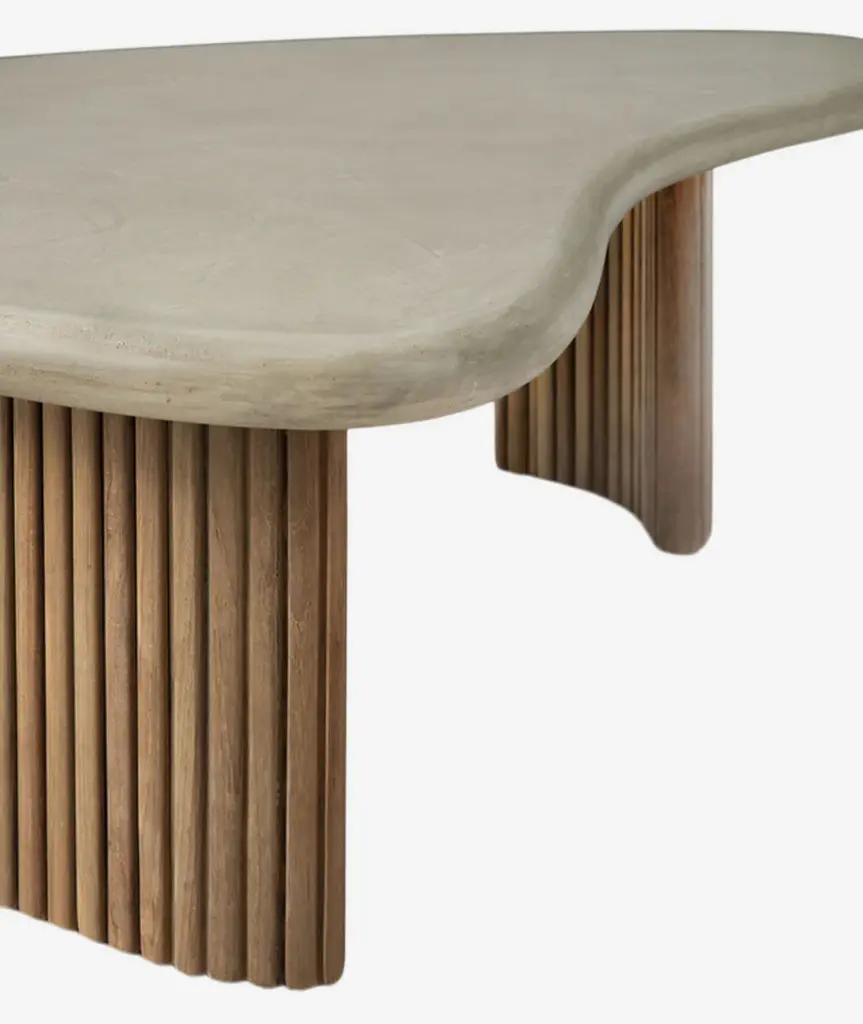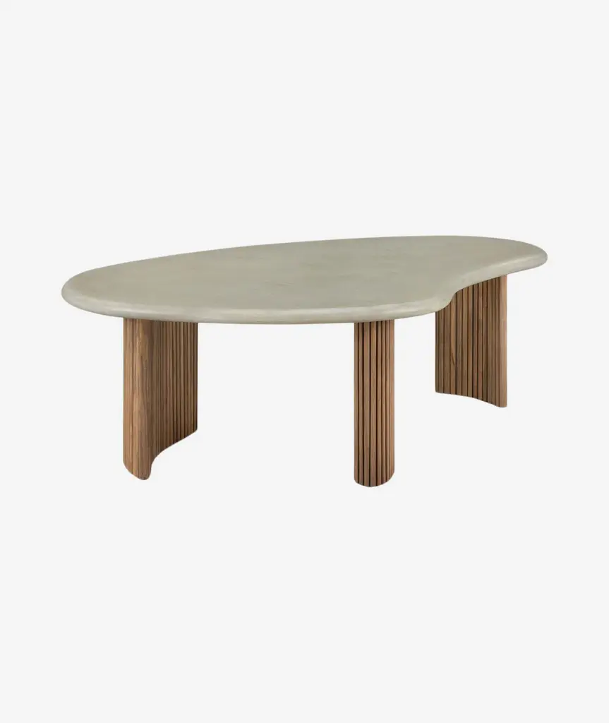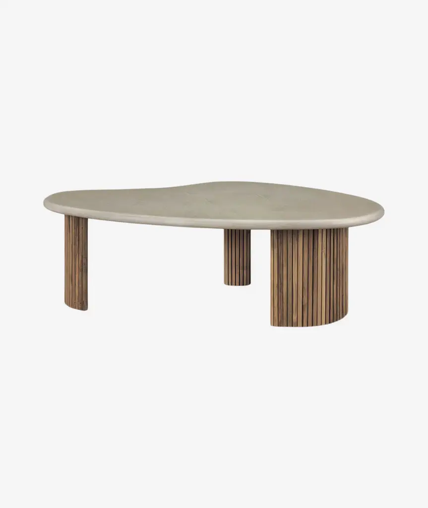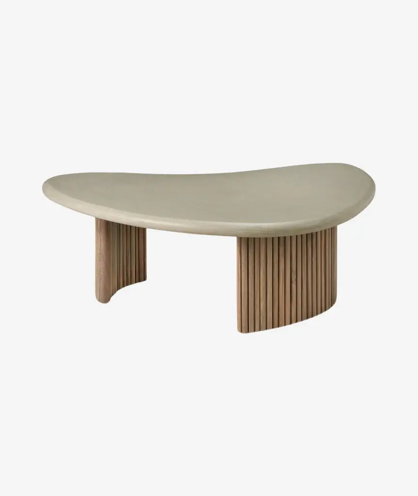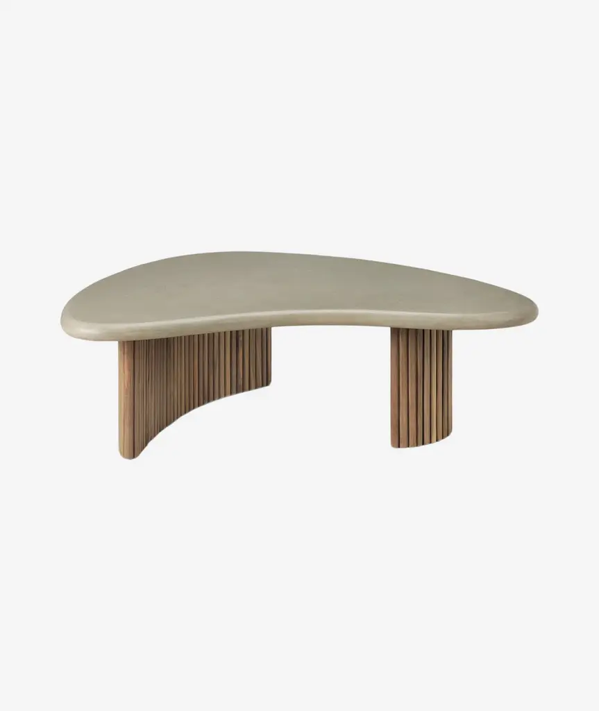 Playful, pebble shapes set on a beautiful, folded, base. Inspired by its popular indoor design, the Boomerang outdoor coffee table features a hand-finished concrete top, paired with a reclaimed solid teak base, a beautiful material mix provides durable practicality to both indoor and outdoor spaces. Configured with the two sizes together, or as a stand-alone, this well-proportioned design is sure to capture attention.