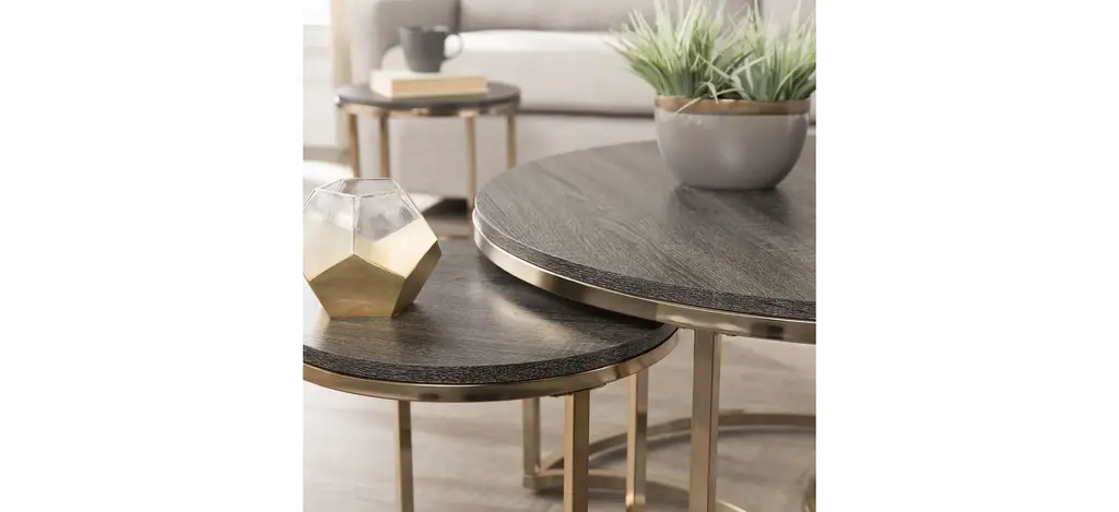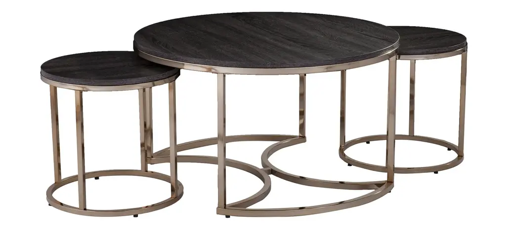 Update your space by the power of three with the Caufield Nesting Cocktail Table Set. Round tabletops and sleek metal bases combine for an eclectic, glamorous look in this living room table set. Slide the two side tables under the coffee table for a cantilevered serving space, or separate around your sofa for a pulled-together look.