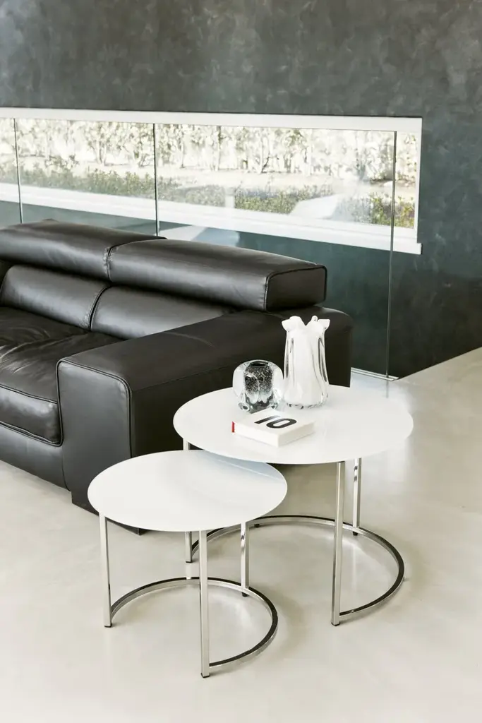 CIN CIN is a pair of low, round nesting coffee tables in different sizes. They are a space-saving solution for modern, design-oriented interiors.The set offers two separate surfaces while occupying the footprint of just one table, thanks to the smaller one fitting neatly underneath the larger.A perfect furnishing accessory to optimize space.Nesting tables with metal frame and painted glass top (extra-clear white, black, moka, or mud).