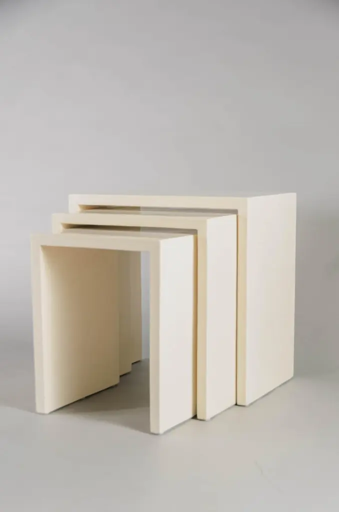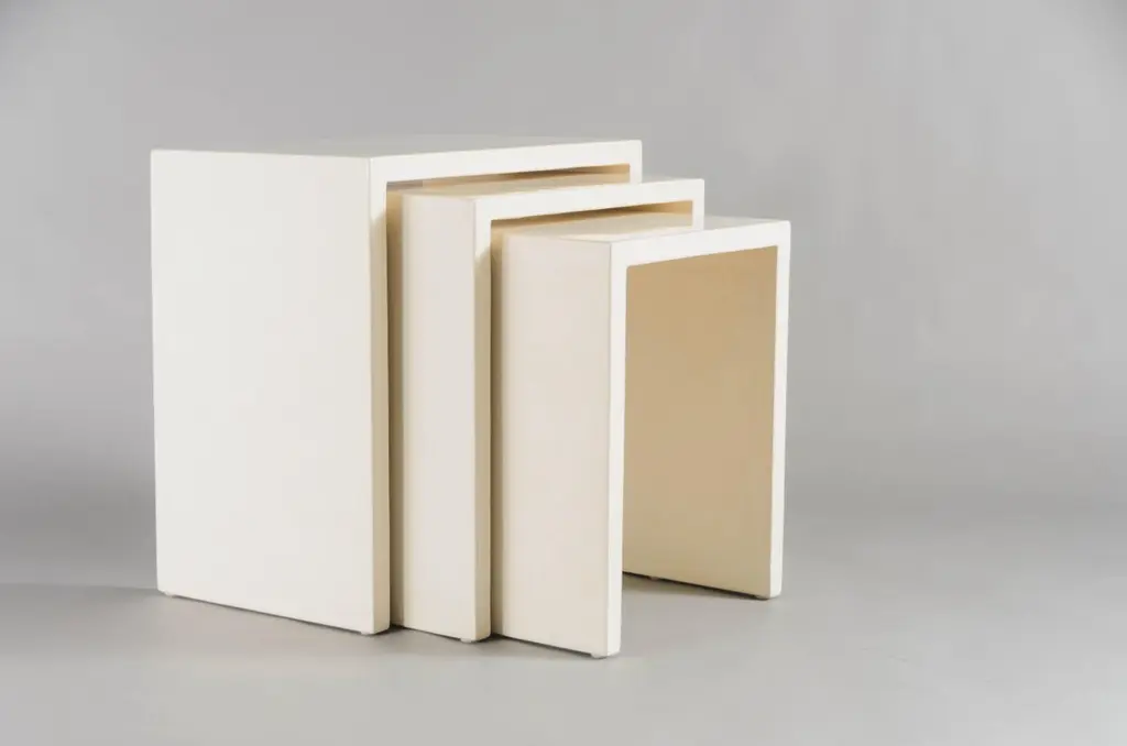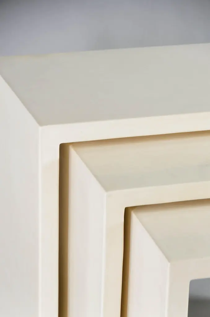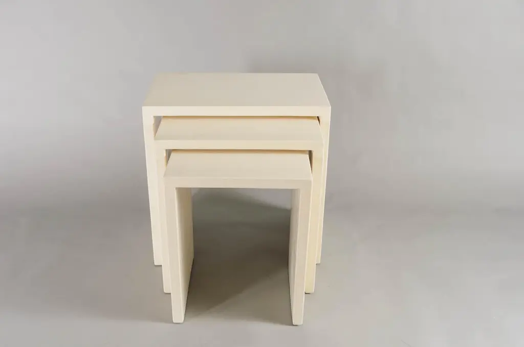 Square Corner nesting tablesCream LacquerWood baseHand made Limited editionContemporary Lacquer is a technique that dates back to the Shang dynasty, circa 1600-1100 B.C. These pieces are made with at least 60 coats of organic lacquer. Each layer of lacquer is applied with a curing period of 24 hours in between so that it can dry. Each piece is individually crafted and is unique. Natural inclusions may show on the lacquer.
