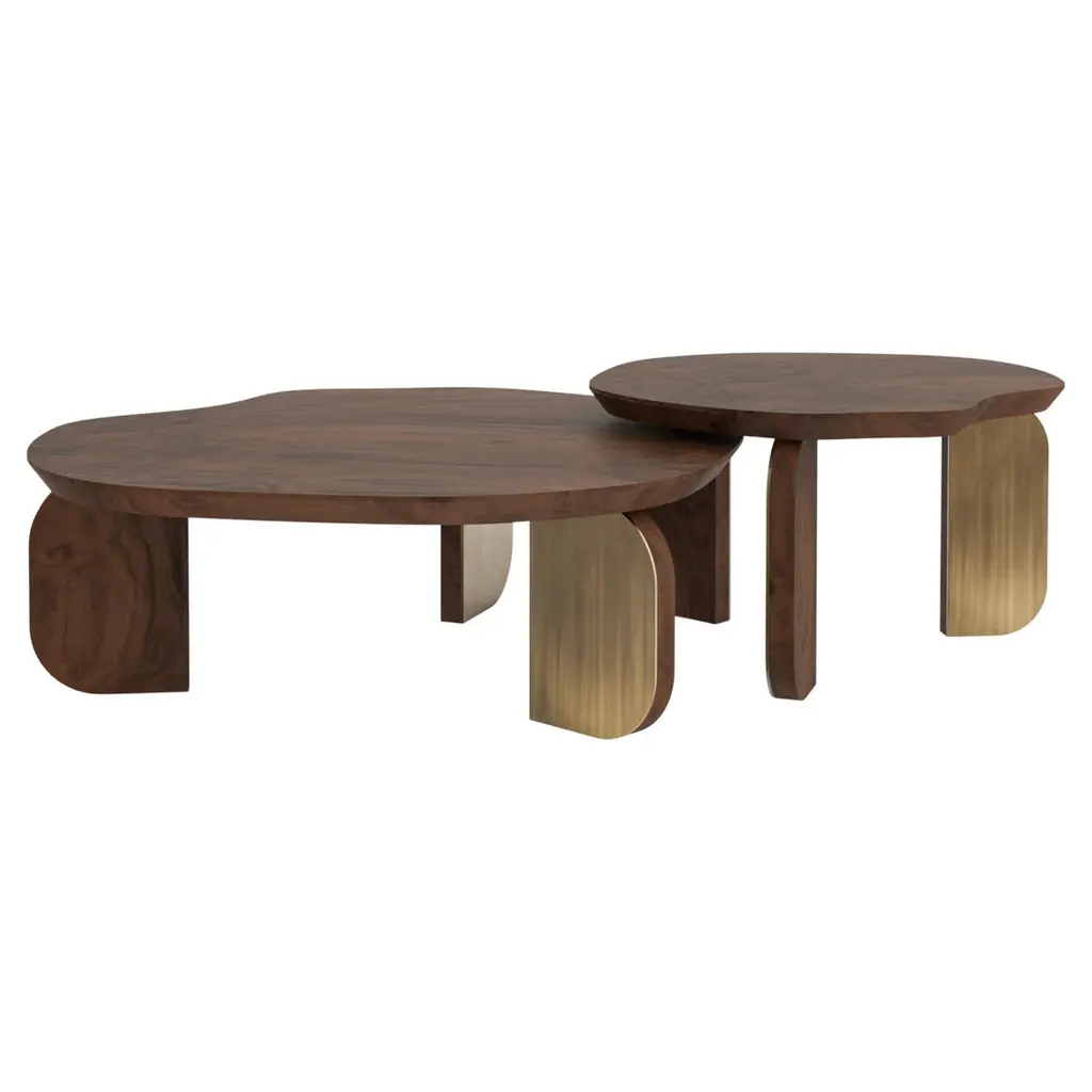 Mid-Century Modern Dornes Coffee Tables, Contemporary Collection, Handcrafted in Portugal - Europe by Greenapple.The Dornes nesting coffee table set is a tribute to Portugal’s scenic beauty and historical heritage. Its organic design mirrors the contours of the village of Dornes, capturing the harmony between nature and craftsmanship. With its natural tones and sculptural form, the Dornes coffee table set brings warmth and character to contemporary interiors.The Dornes coffee set consists of two coffee tables, each crafted from natural walnut root veneer with open-pore and matte varnish and details on the legs in antique brushed brass with matte finish. The veneer is anti-fungal and vermin-free, ensuring longevity and preservation.The Dornes coffee set can be customized in terms of dimensions, materials and finishes.Set of 2 Dornes Coffee Tables DimensionsMedium:W.76 x De.69 x H.41cmW.29.9 x De.27.2 x H.16.1 in.Large:W.105 x De.100 x H.35cmW.41.3 x De.39.4 x H.13.8 in.Set of 2 Dornes Coffee Tables Material CodesWD154 Walnut Root, Open-pore, Varnished, Natural Brown Walnut Root, MatteME032 Brass, Brushed, Burnished, Varnished, Antique-Brass, MatteHandcrafted in Portugal - Europe by GreenappleUnique by design, Crafted by peopleGreenapple transforms contemporary spaces into exclusive narratives of design and craftsmanship. From custom-made furniture to bespoke interiors, each creation is a timeless work of art, shaped by master artisans who honor centuries-old techniques.Founded in 2005 by Sérgio Rebola and Rute Martins, Greenapple has earned global recognition among high-end clientele and leading design firms. While Rute designs each unique piece, Sérgio ensures uncompromising quality from design to production and from production to your home. We provide a seamless experience, offering short production lead times, worldwide delivery within 7 to 10 days, and white-glove service upon request.For U.S. clients, we can handle all customs clearance, cover duties, and offer white-glove service as well upon request.Cocktail Table, Center Table, Centre Table, Low Table, Tea Table