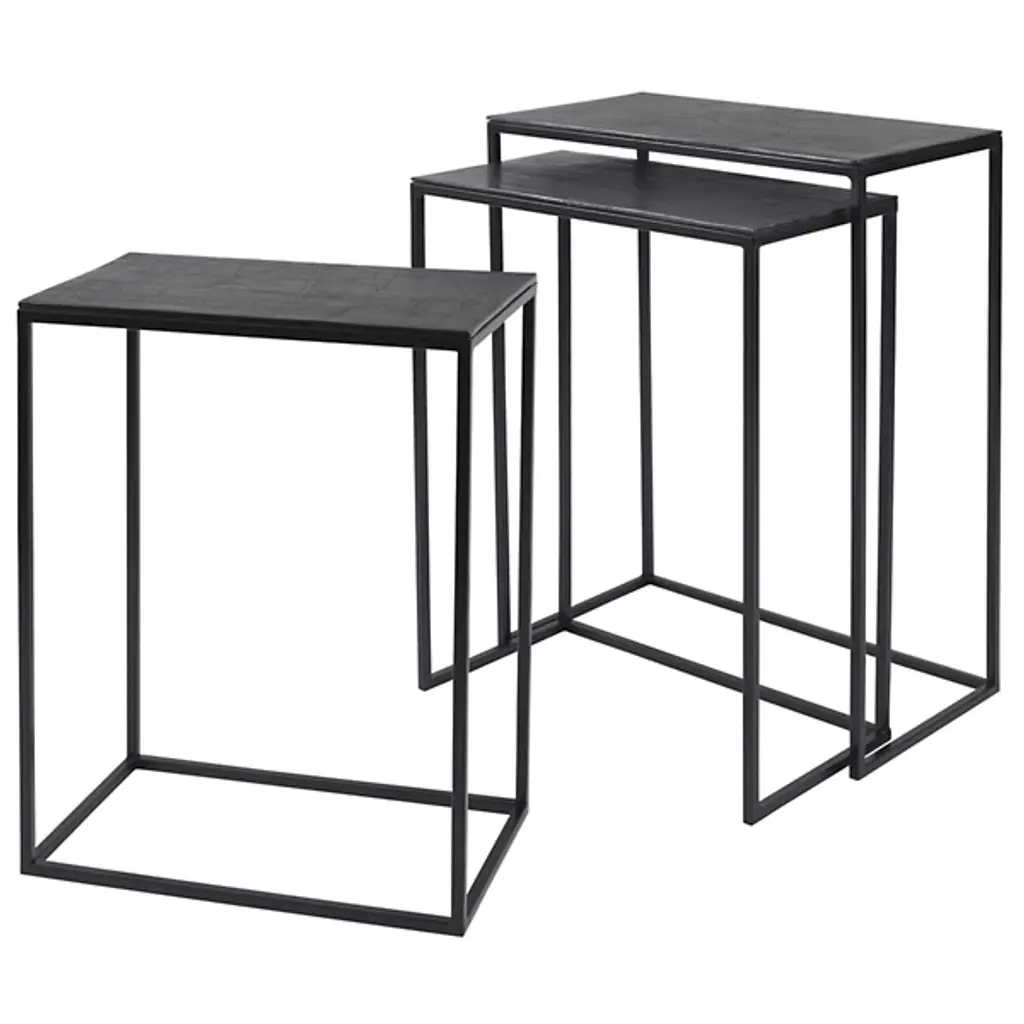 Bring innovation to your living space with the Coreene Nesting Tables by Uttermost. Fine aluminum has been worked into a collection of frames. Onto these frames are fixed sturdy tabletops for the placement of your framed photos, contained appetizers, and more. Each table takes on a linear style, giving this furnishment group a minimalistic sensibility. The geometric frames form legs that situate the tables at varied heights. When connected, your collection boasts an ascending look. Your table can be separated for individual use.