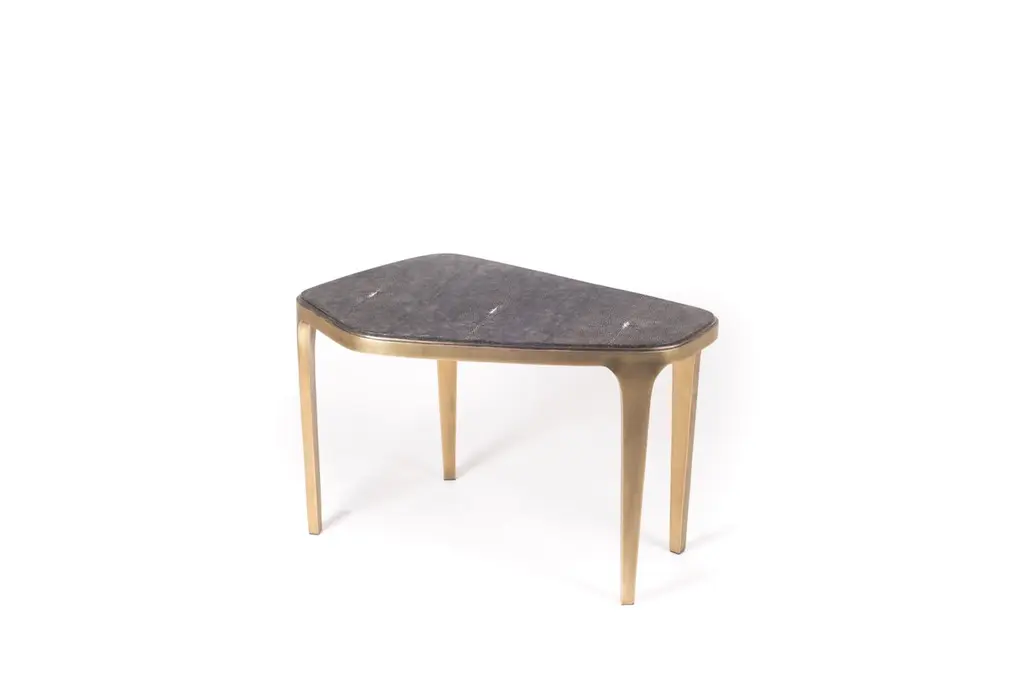 The Paris based label has distinguished themselves since their launch, with their iconic use of shagreen mixed with brass and other exotic materials. All furniture is handcrafted by skilled artisans, ultimately making each piece unique, designed in Paris and produced in the Philippines.The Cosmos nesting coffee table medium is both Minimalist and dramatic. The top is inlaid in Hwana Stone and completed with bronze-patina brass. The stone tops has beautiful color mixture tonalities in it. With its beautiful amorphous shape this piece adds a statement to any room. Available in other finishes and two other sizes to create a nesting set, images at end of slide. The dimensions of this piece are 66 x42 x 43 cm /26"x16.5"x17"All R&Y Augousti pieces are handmade by artisans, ultimately making each piece unique. Custom color/sizing available on request. Wipe clean with soft dry cloth.Acclaimed design duo Ria & Yiouri Augousti have established themselves since the 1990s as pioneers of modern-vintage style through their luxurious Art Deco inspired collections.The Paris based label has distinguished themselves since their launch, with their iconic use of shagreen mixed with brass and other exotic materials. All furniture is handcrafted by skilled artisans, ultimately making each piece unique. All shagreen-covered items should be kept out of direct sunlight, color variants may occur on the stingray and other exotic finishes, but this showcases the Parisian label's commitment to creating authentic luxurious products using natural components.For all pieces inlaid with stone and semi-precious stones, due to the natural quality of the material color tonality and pattern placement may differ slightly per piece.