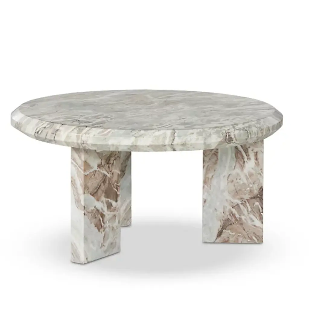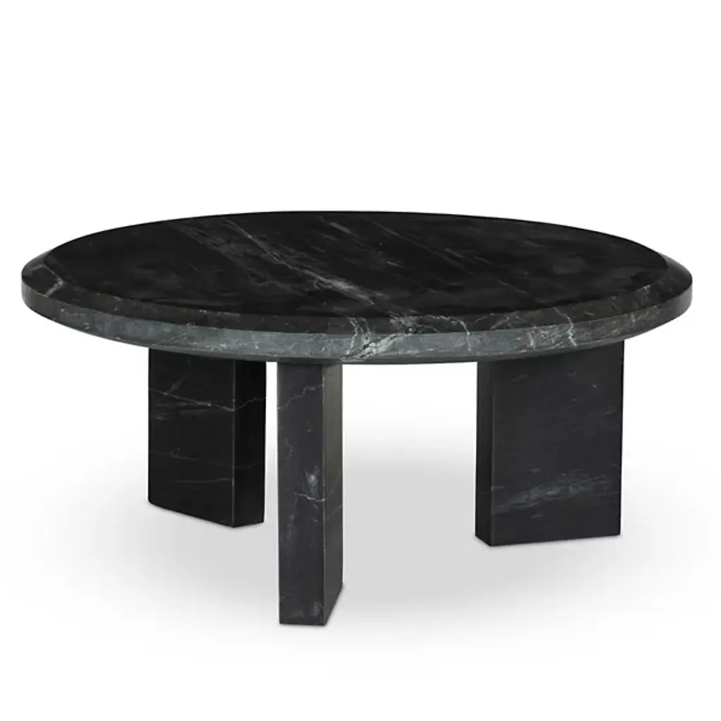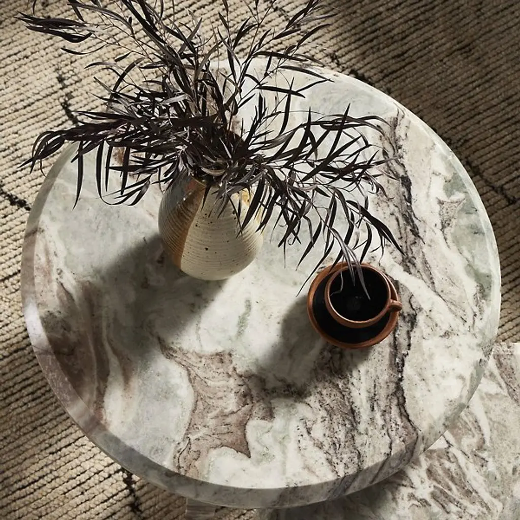 The Dakota Nesting Coffee Table from Four Hands honors marble's natural character. Block legs support a substantial top with precisely chamfered edges, creating an architectural presence. Each piece displays unique veining patterns, celebrating the stone's organic formation. The proportions suit intimate spaces while maintaining visual weight. This table represents thoughtful reduction - removing unnecessary elements while preserving essential beauty. The solid marble construction provides both stability and sophistication, indicating how natural materials can define space through simple forms.
