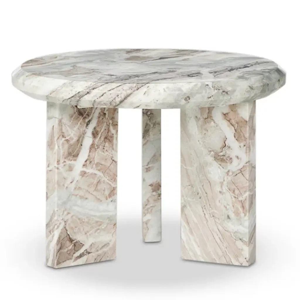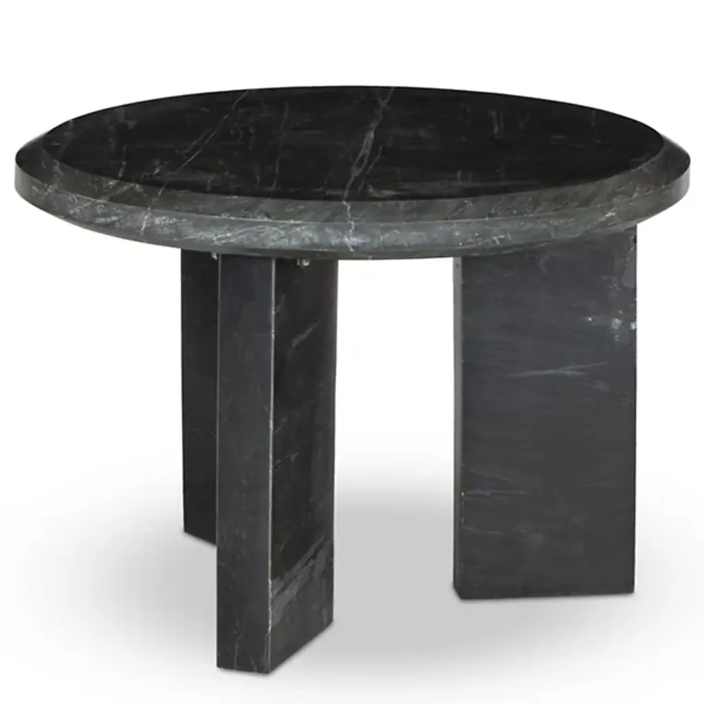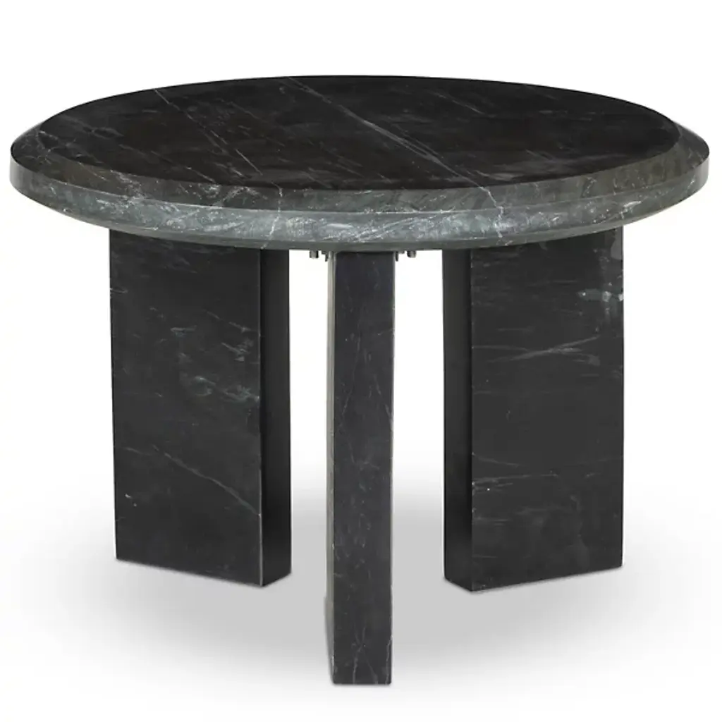 The Dakota Nesting Coffee Table from Four Hands honors marble's natural character. Block legs support a substantial top with precisely chamfered edges, creating an architectural presence. Each piece displays unique veining patterns, celebrating the stone's organic formation. The proportions suit intimate spaces while maintaining visual weight. This table represents thoughtful reduction - removing unnecessary elements while preserving essential beauty. The solid marble construction provides both stability and sophistication, indicating how natural materials can define space through simple forms.
